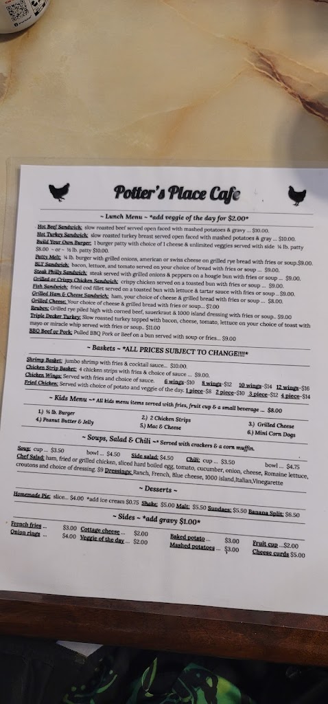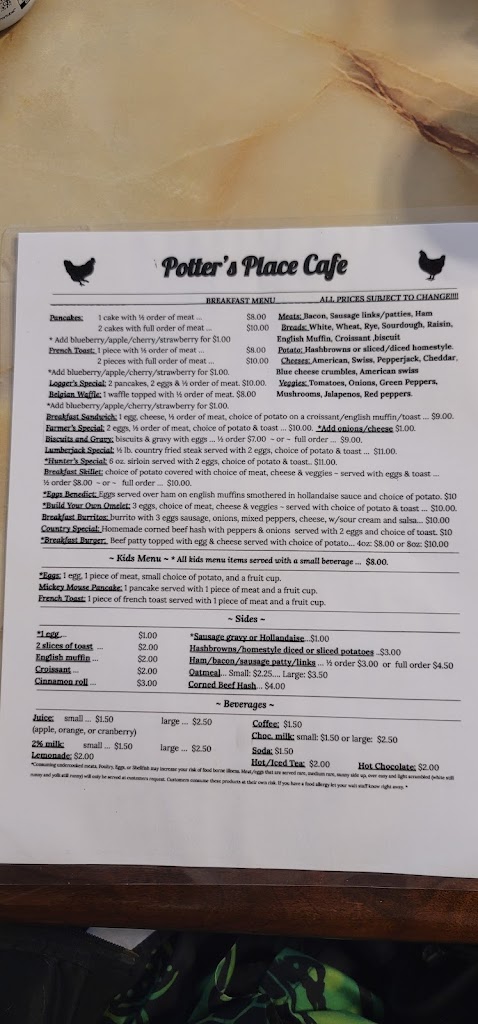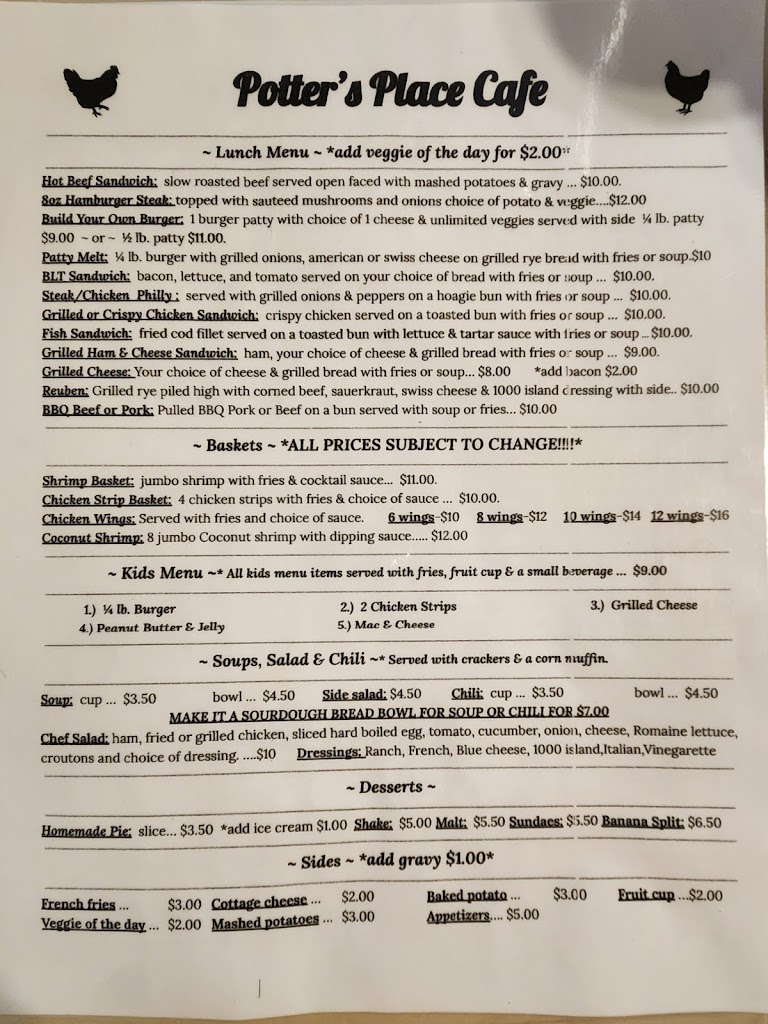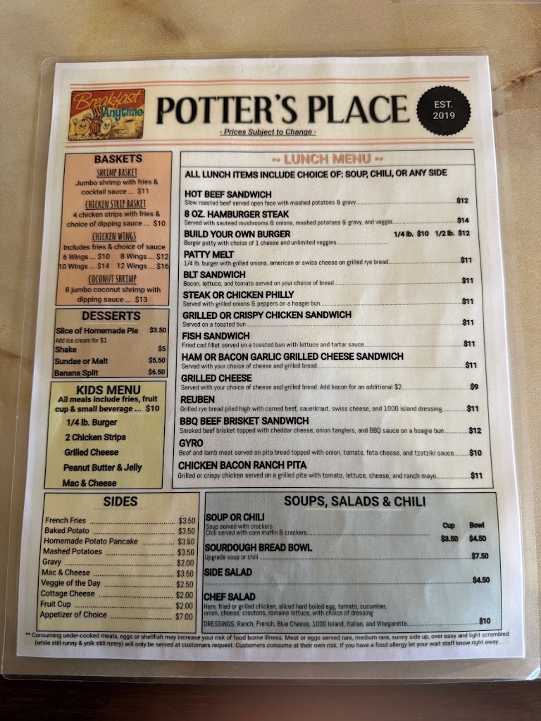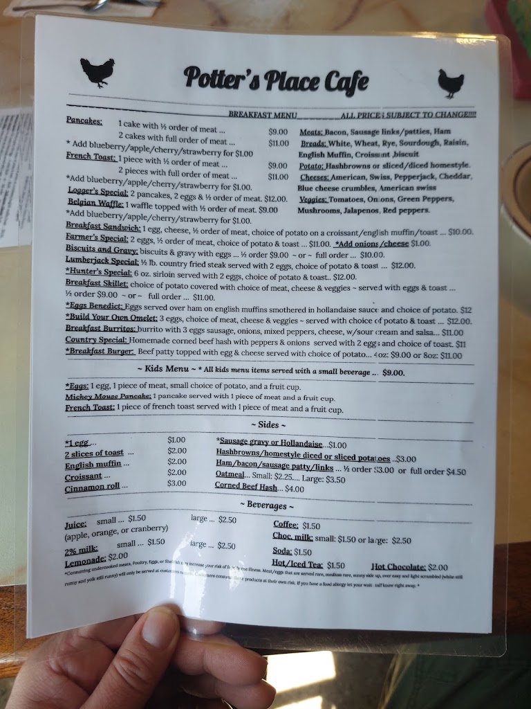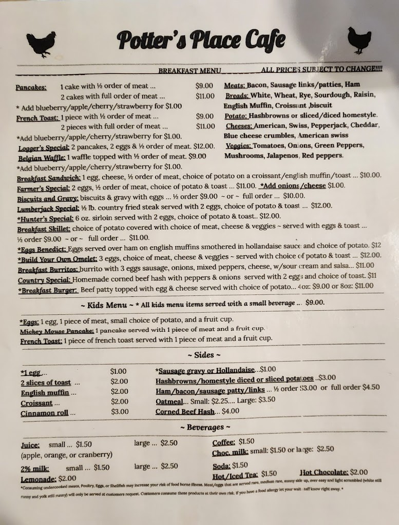 We had breakfast at Potter's Place this morning and it was great. The service was good and we had all we could eat. Price is very reasonable so be sure to tip well.