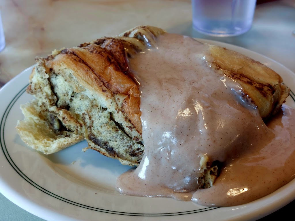 Went for breakfast on a Saturday late morning. It was busy, but we were seated quickly. Service was slow. The menu has descriptions. I ordered a large breakfast set and a cinnamon roll. The eggs were cooked very well. They toast was thick. The bacon gooooood. The hashbrowns were undercooked. The cinnamon roll was cinnamon bread loaf with frosting poured on top. It was good, but not a cinnamon roll. Would eat here again.