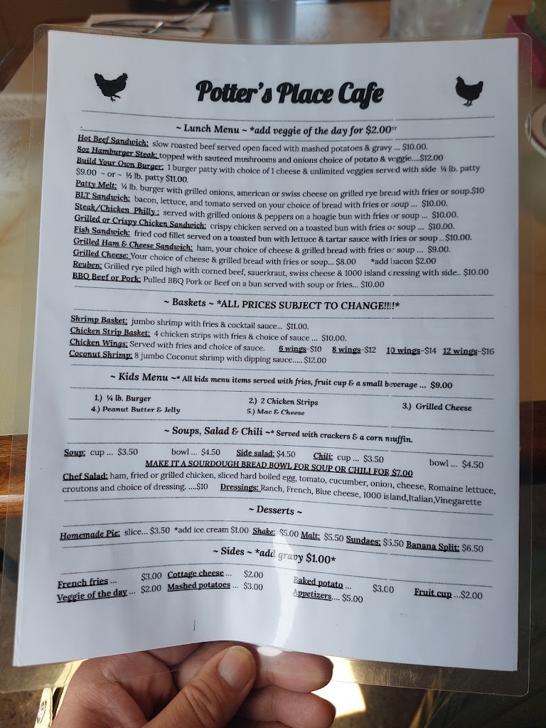 Very traditional small hometown cafe. Only cash, no credit card. Bathrooms are small but clean. Staff friendly, cordial, and very helpful. Menu photos as of July 2024.