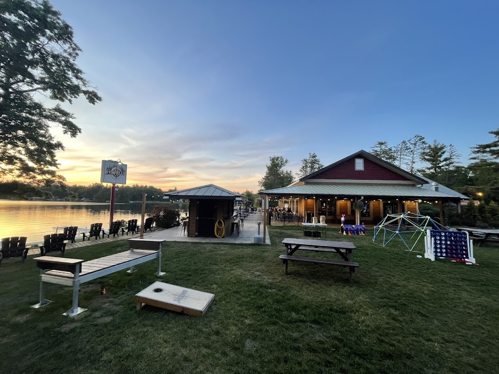 First time customers. Location is great. We were greeted right away when we arrived. Immediately sat at a table on the beautiful patio overlooking the lake. Very pleasant server. Drinks and food came out quickly. After eating, we finished up our visit with several of the "yard games" that were set up for their customers. Very clean and well kept. Would definitely come back.