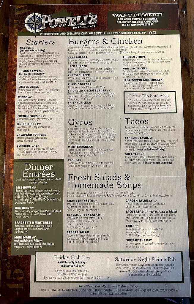 I have eaten at Powells maybe 20 times. Eighteen were Friday for the fish. They serve walleye. I have eaten fish frys all over western Wisconsin and this one never disappoints. Never mind all of the “all you can eat “ places serving crappy cheap fish, Powells serves one big walleye filet that is perfectly cooked every time.