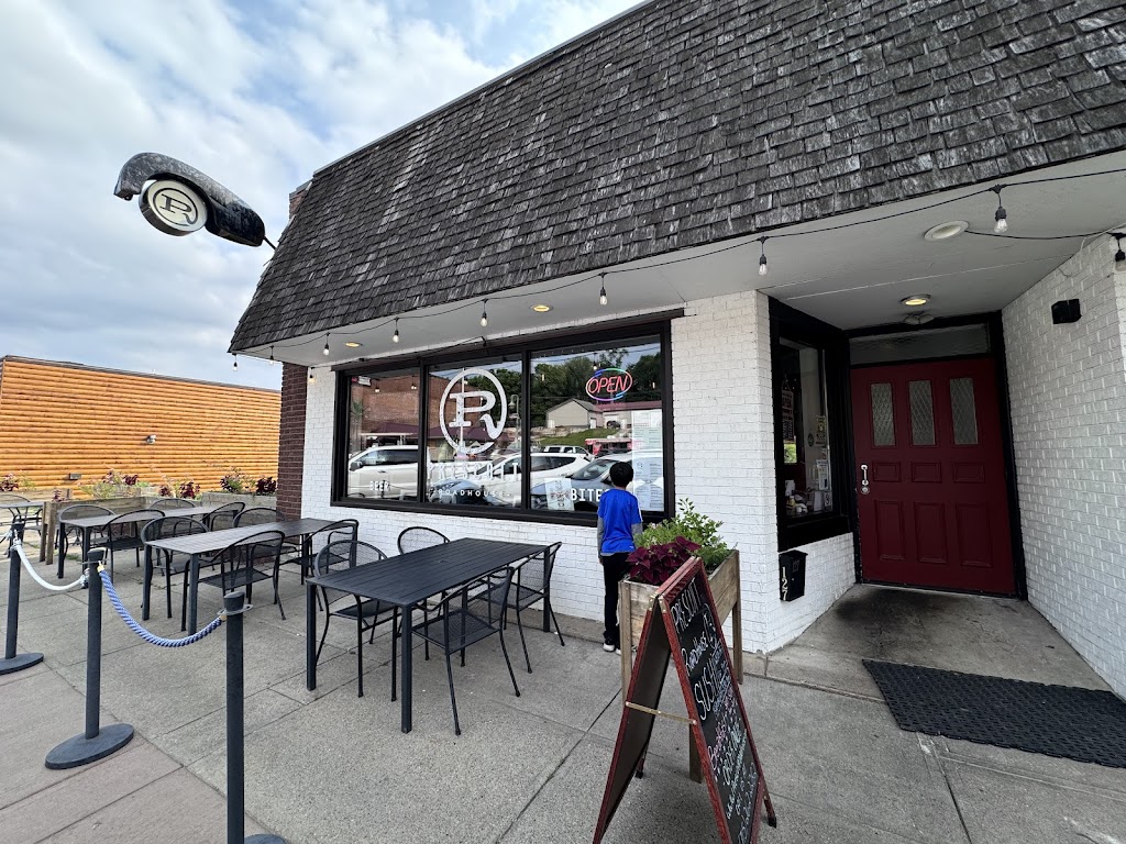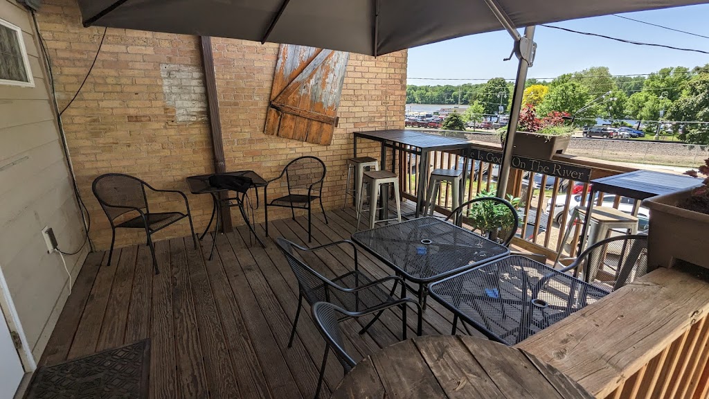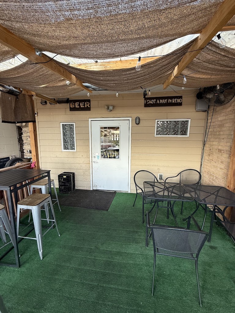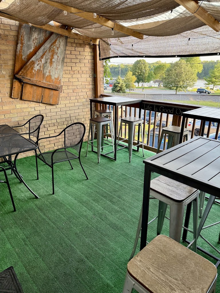 A few patio tables on the main strip, cozy bar/dining area with great food and selection of beer on tap. Small deck patio in the back. Staff was awesome!