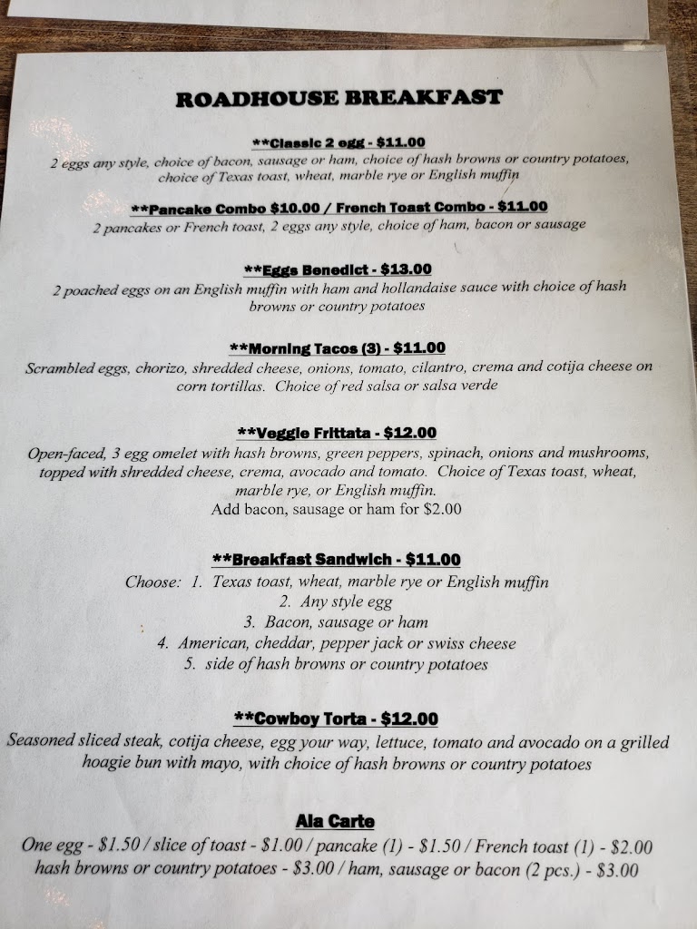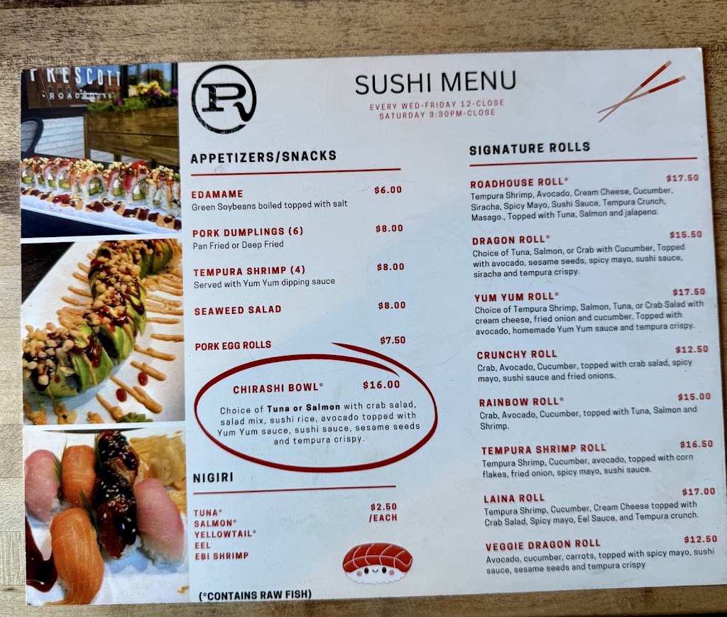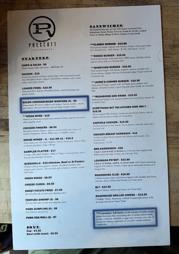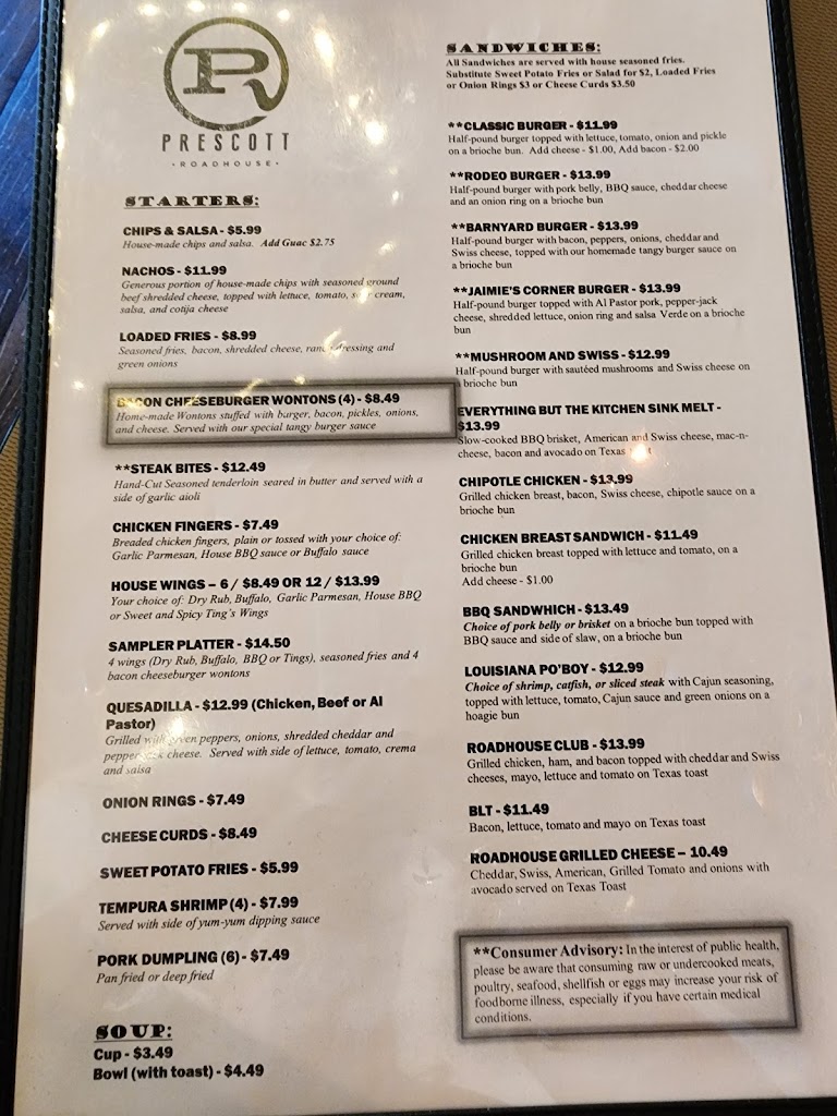 The Prescott Roadhouse is great. Super good food during the week and Pho, Bun sandwiches and sushi at the end of the week are fantastic. Great staff, fun place to be - and always great food. Great compliment to Prescott.