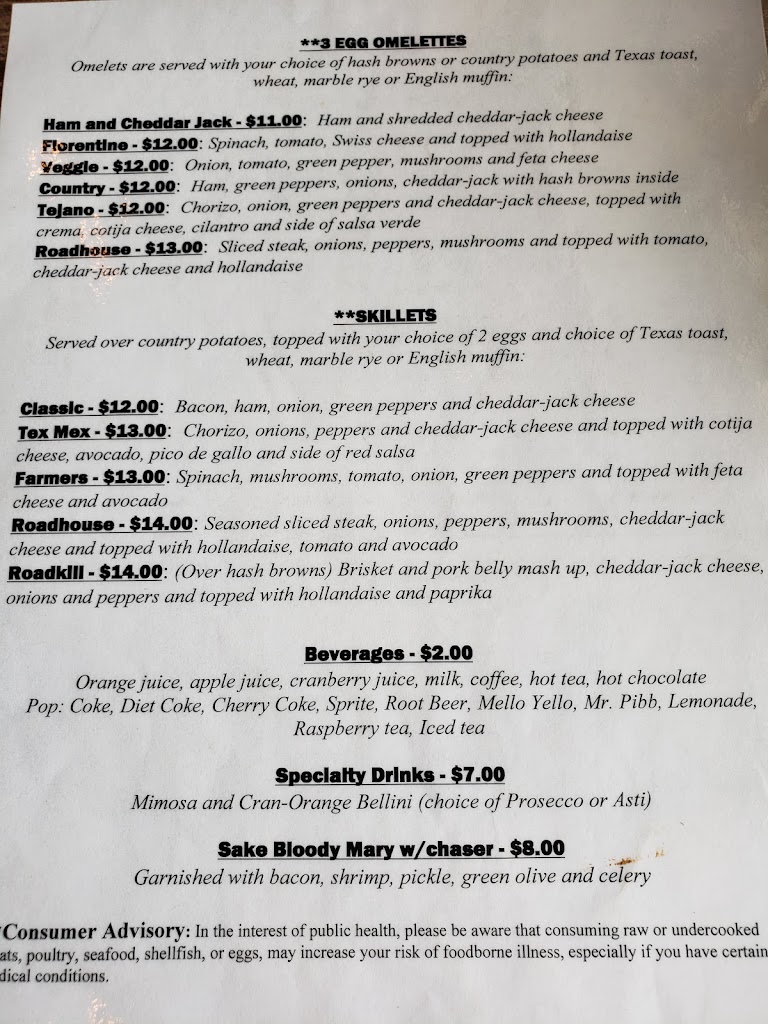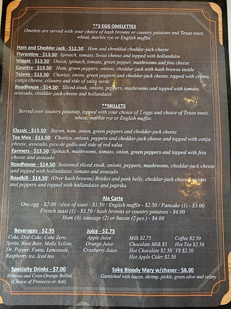 One of the best breakfast I've had in a long time. Service was awesome and prices reasonable. I highly recommend the roadkill skillet. Pork belly and brisket with onions peppers eggs hash browns and hollandaise sauce, they smoke the meats in house YUM!!