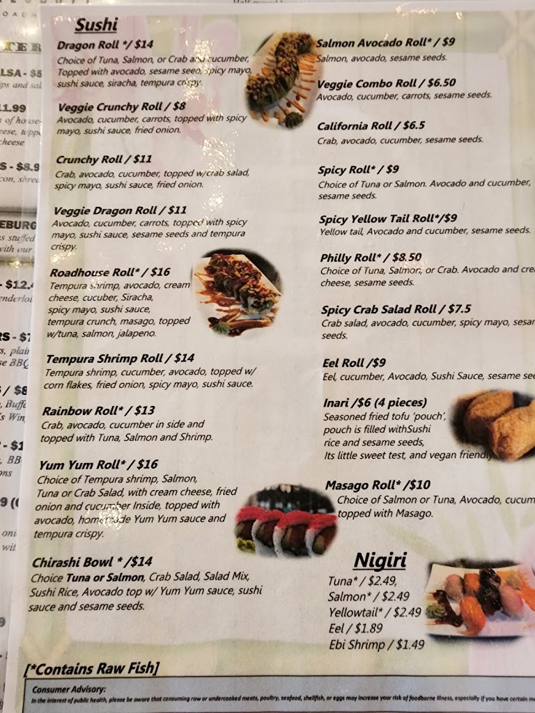 Sushi roll we had was BOMB, service was great! Menu has a lot to offer, Japanese, Mexican, American and Southern. Would absolutely order Sushi when we return!