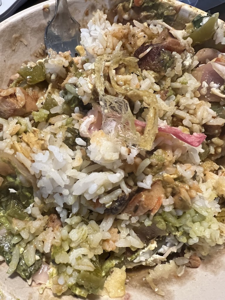Plastic in food unfortunately. Rice always seems to be undercooked.