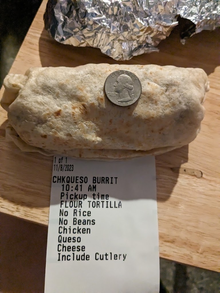 Love my burritos. I usually order a la carte to shave off $2-$3 off my bill per burrito. The white rice usually has some undercooked bits but nothing I'm complaining about.