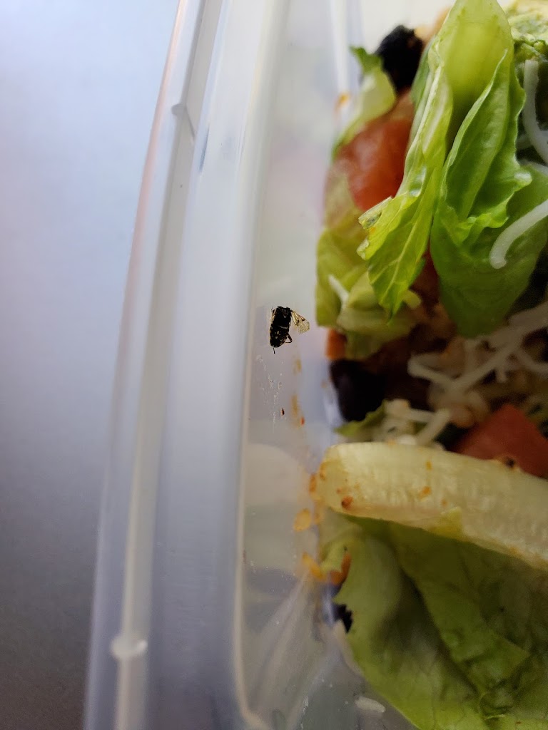 This time out of convenience and time, I decided to stop by. I ordered take out. Here is what I found in my food. 🤢 I'm officially done. Never going back to this location regardless of convenience. They obviously don't clean there. I'm not sure what time of bug this is but he was very attached to my plastic container. I hope it's not a roach. 😫🤮 BTW chips were stale too.