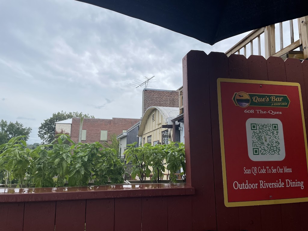 If you’re looking for a sandwich with fresh ingredients, made to order, and a nice view of the river, you’ll like Que’s. If you’re hoping for a burger and fries, or greasy deep fried bar food, go elsewhere. Chicken, beef, pork and veggie sandwiches include fresh toppings like red peppers, artichokes, tomatoes, and a variety of cheese; and are served with chips or coleslaw. Soup is available in the “cold” months. The deck has only four intimate tables, so if your party is large you might be disappointed, but there’s additional seating inside. The bartender/owner is a friendly fellow and he keeps the place clean, including the restrooms. I’d stop by again if I was passing through town and hoping to relax by the riverside.
