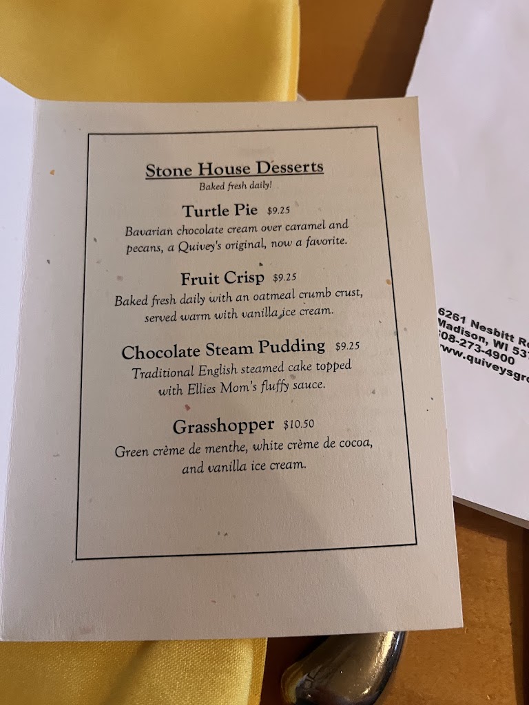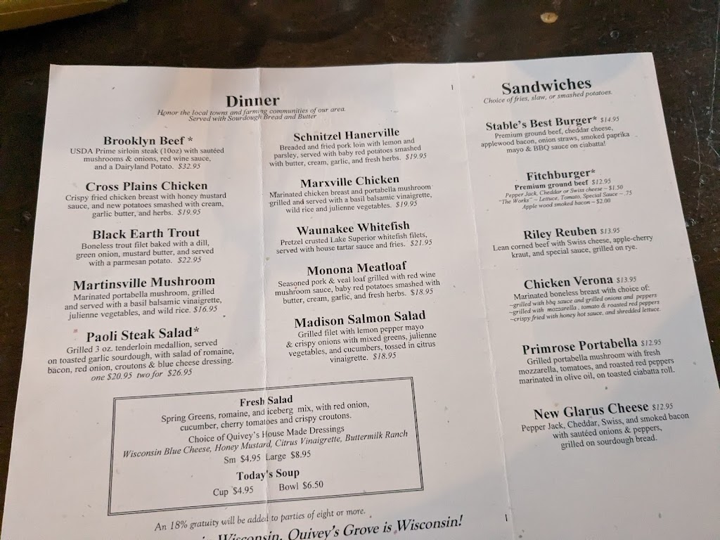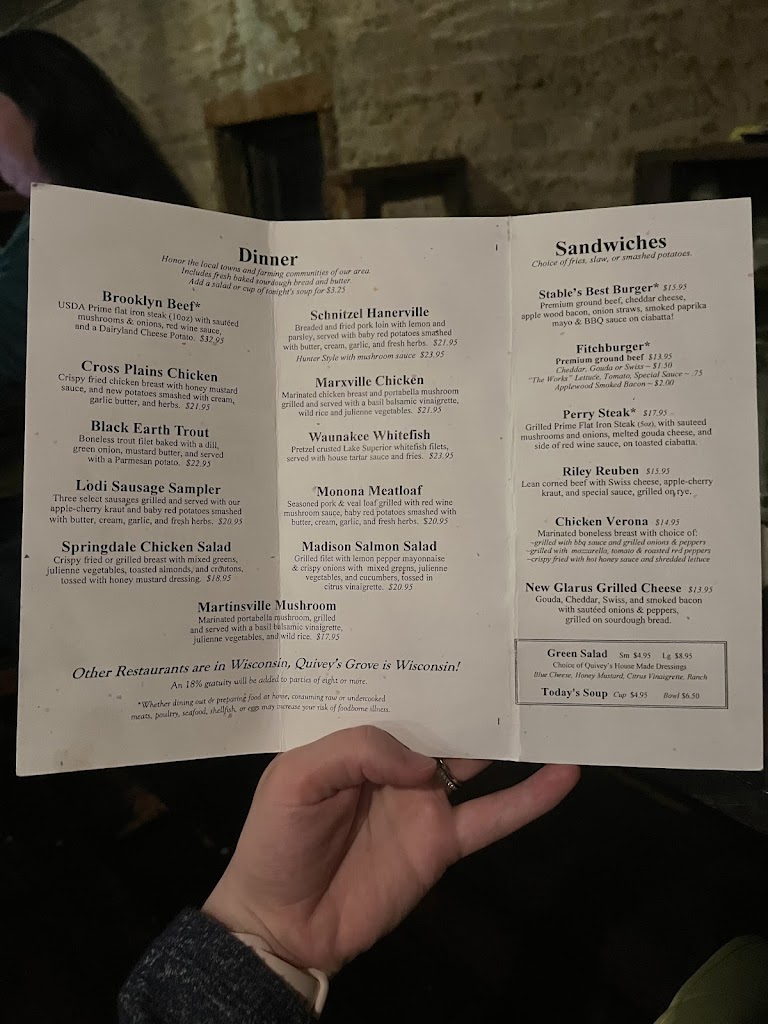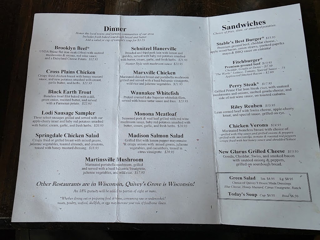 Quiveys is a unique setting with excellent food options. We have come numerous times for special occasions and never been disappointed, whether in the house or in the stable.