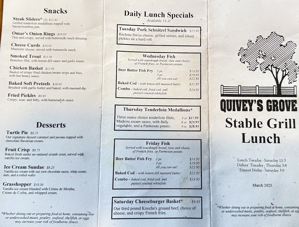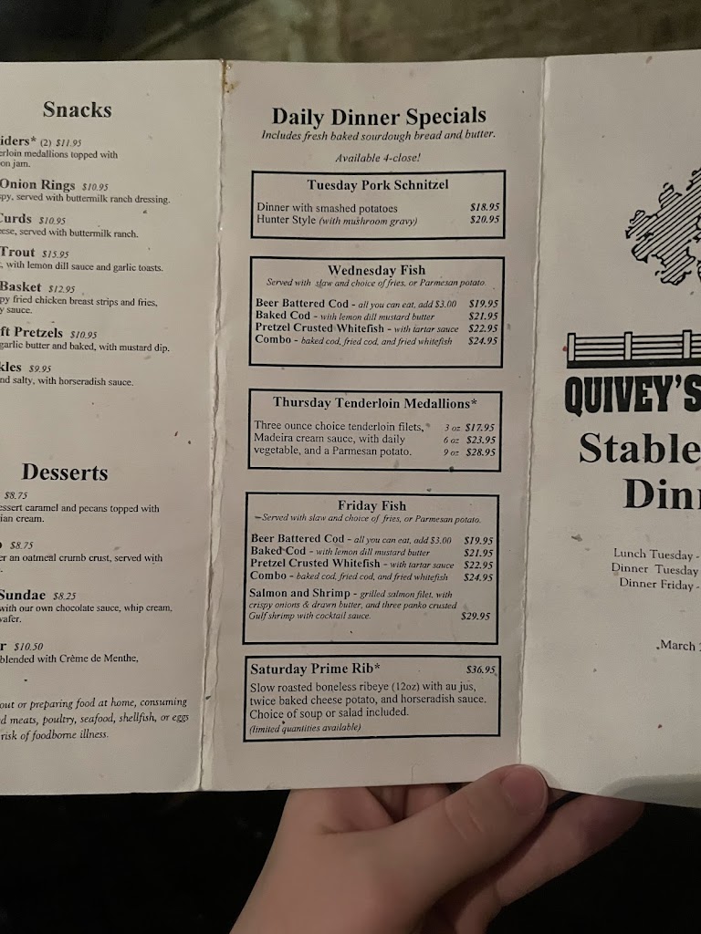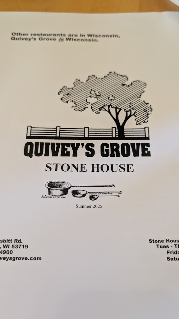 Had dinner at the stone house at quiveys one word sums it up regret. I ordered the fish it tasted like old grease i sent it back and they brought the chicken it was even worse. Same old grease taste but also sour smell. I couldnt eat it. My husband tried it and spit it out. If your menu is mainly fried try changing the grease. Yuck
