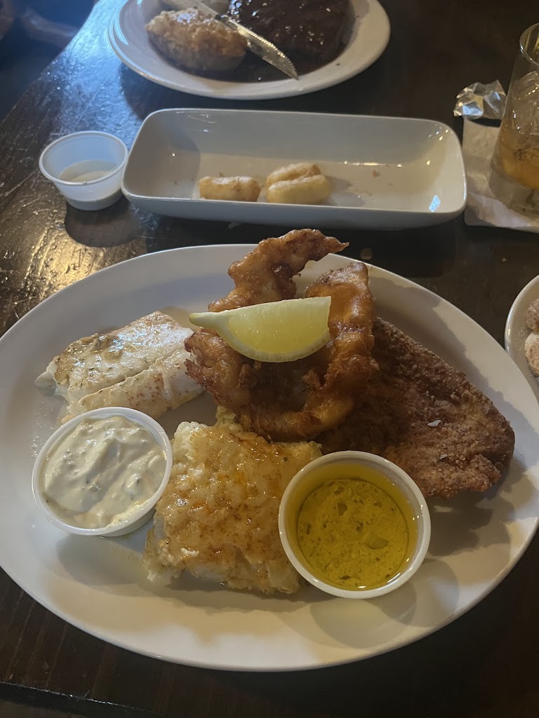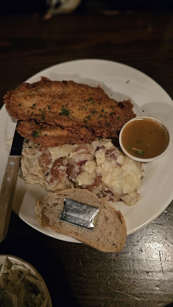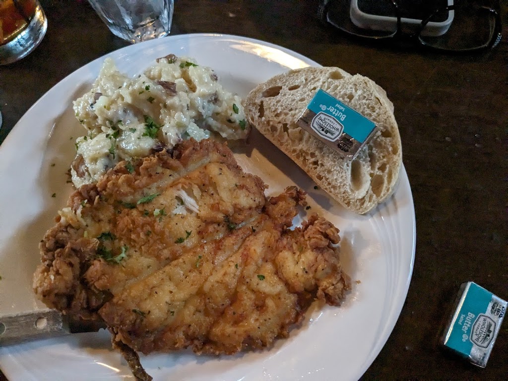 Spouse and I came to the old house for a quiet fish fry. Service was good. Food came out very quickly. The pretzel perch was excellent. The slaw was good and the muffin a nice touch. Their much touted potato item is good but small. One star taken away for cold air vent in floor blowing on our legs.