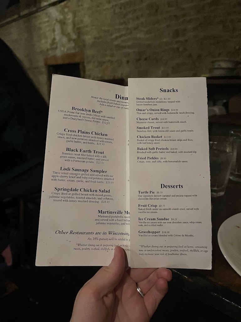 The atmosphere of this place was top-notch! The old fashion 's were great. Cheese curds were average but had excellent made in house Ranch! The beer battered fish had great flavor but was pretty doughy. The cheesy parmesan was excellent, and I could have eaten a plate of that! Definitely recommended. The cross plains chicken also has great light breading but was a bit tough. That does happen. You can't always control the proteins! Would definitely go back to try a few other items.