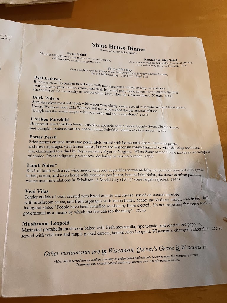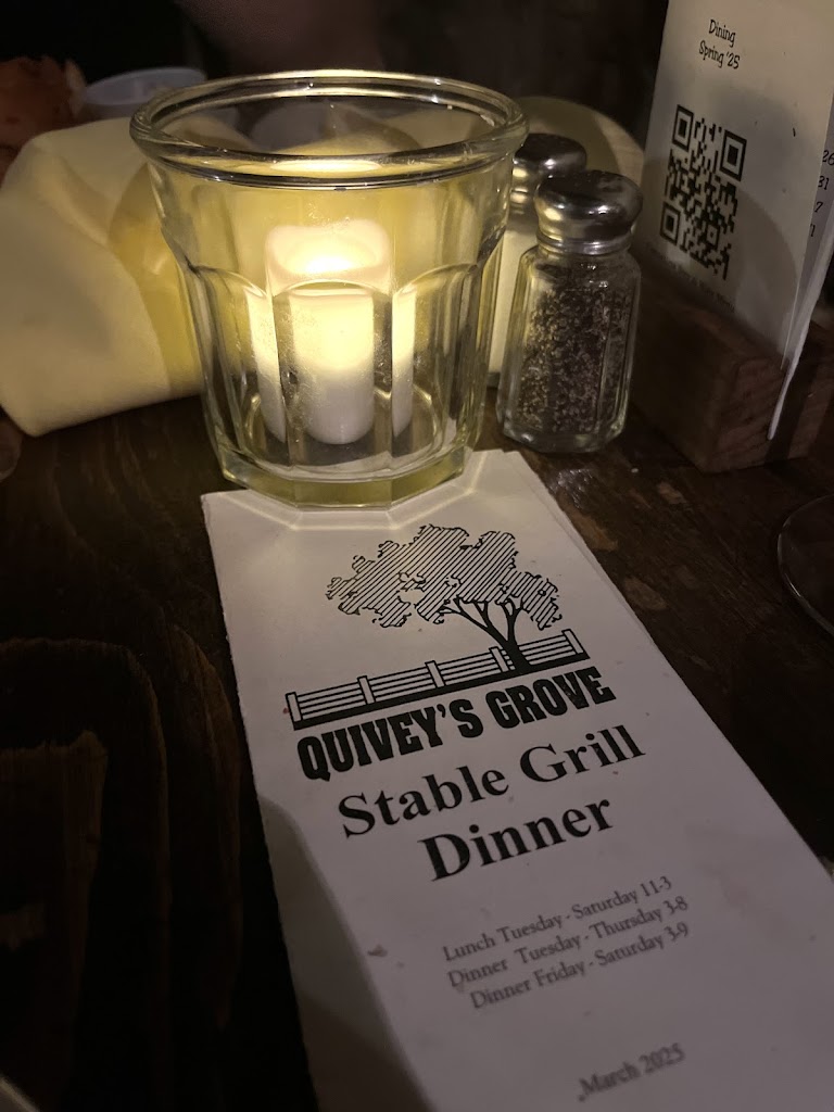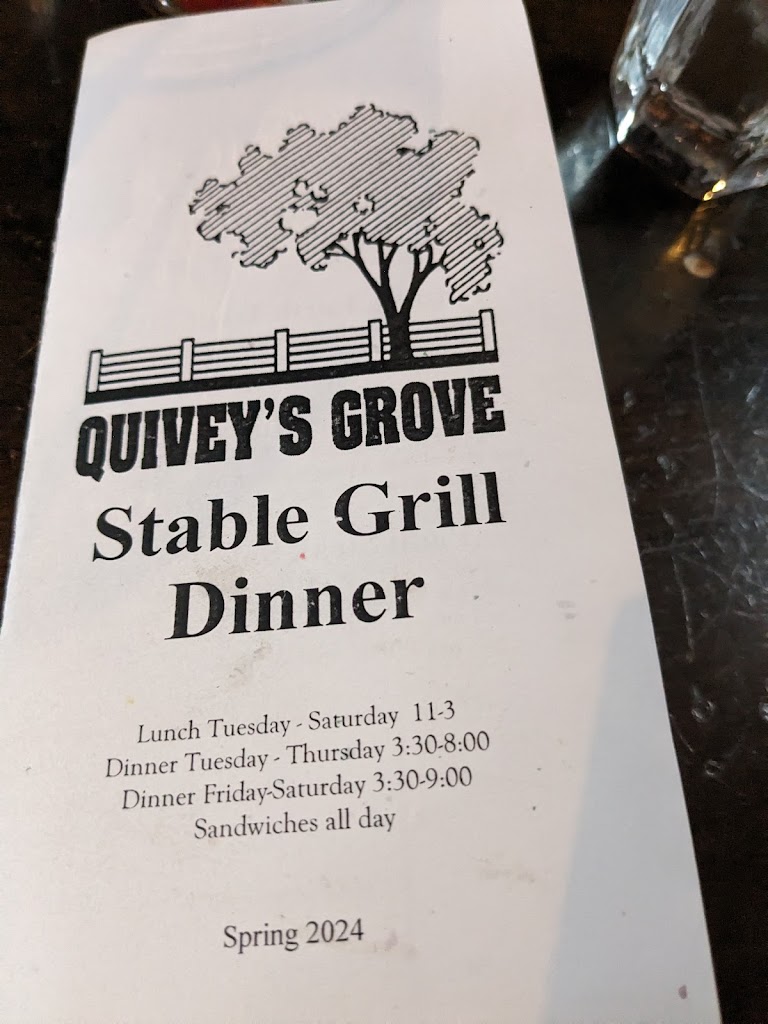 Excellent food and service in the Stone House for our group of 13 diners. Quivey’s Grove is still great after all these years.