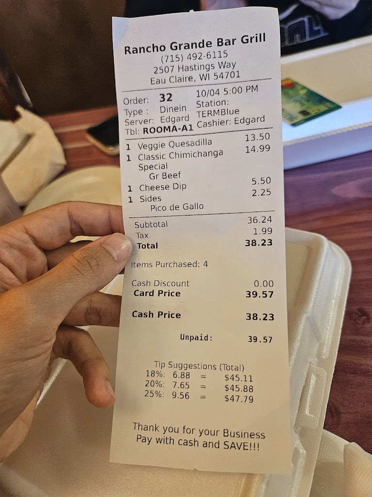 The food was very good. Huge portions. I have dined at Cancun Grill since the second week they were open but quit going there when they started charging to use a credit card and started charging for to go orders. I was very disappointed Rancho Grande also charges for credit card usage. Credit card costs should just be a cost of doing business just like asking for a container to take home uneaten food, extra napkins, etc. Best of luck to all the great people that waited 0n us.