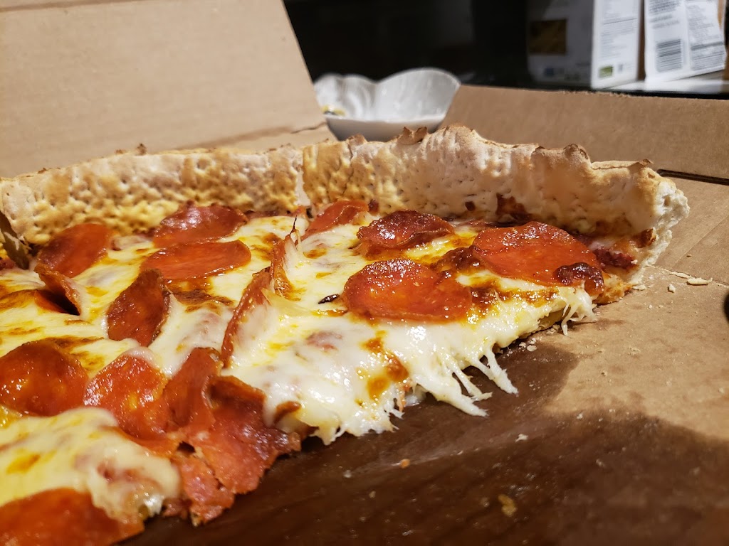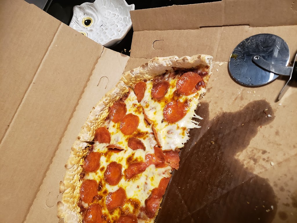 "Deep dish" pizza is a thin crust pizza with tall crust. Arrived late. It tastes ok, I guess, but this is certainly not what I ordered. Kids are hungry tho, so I guess it'll get eaten