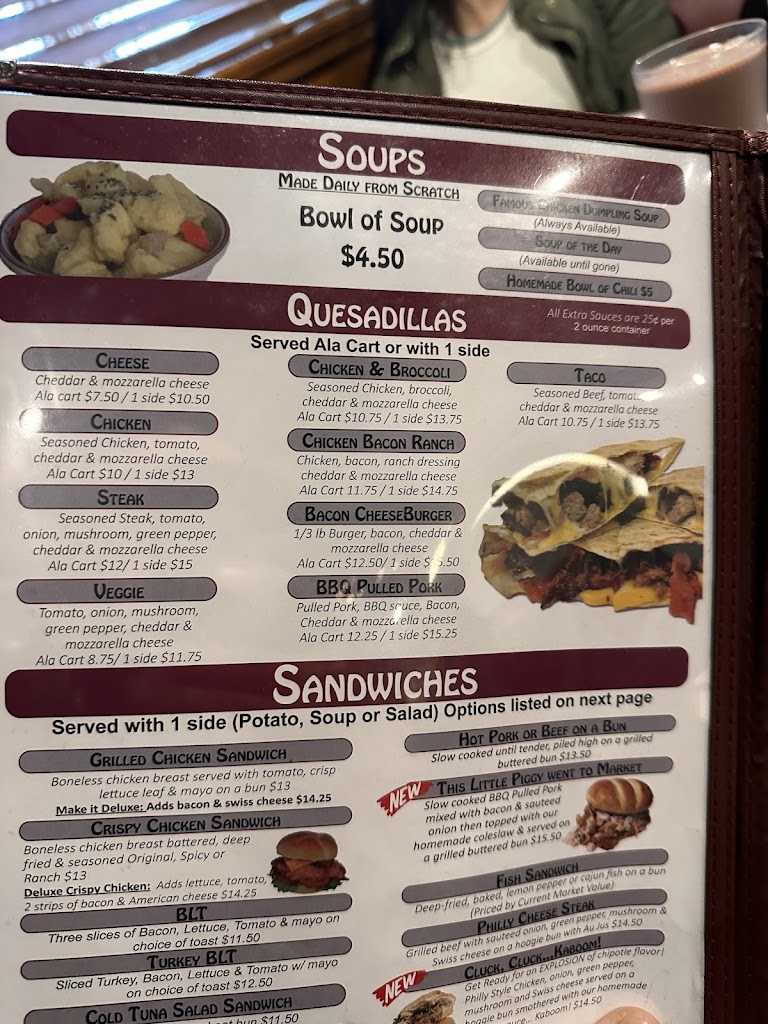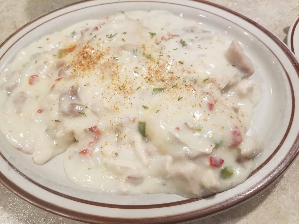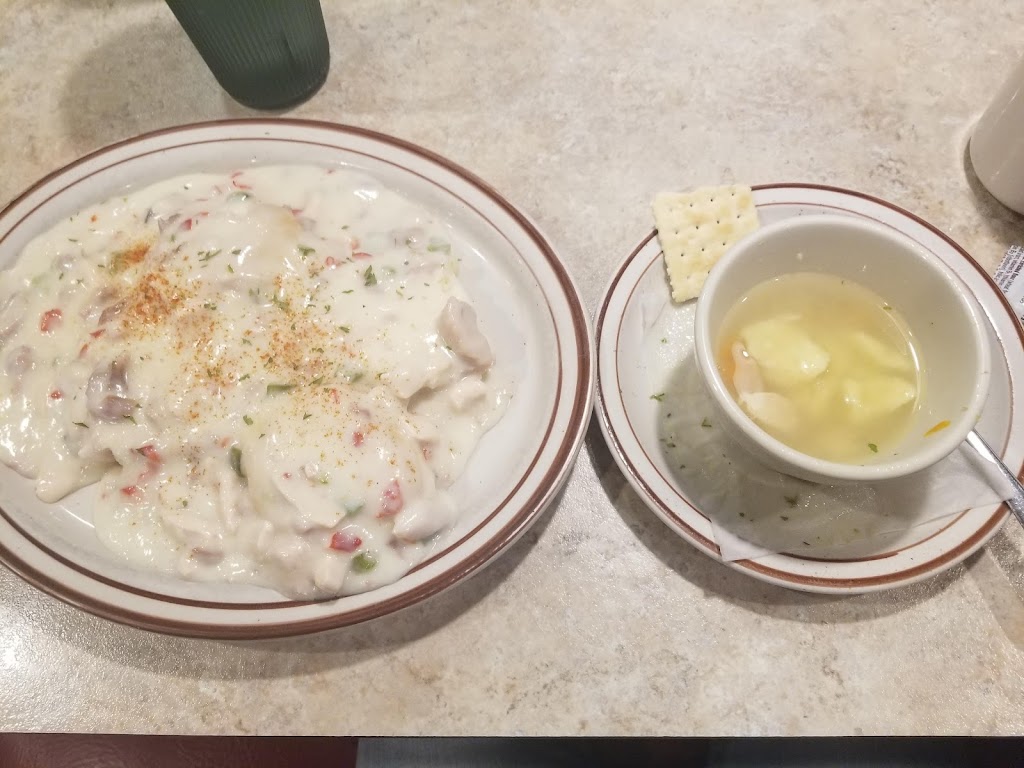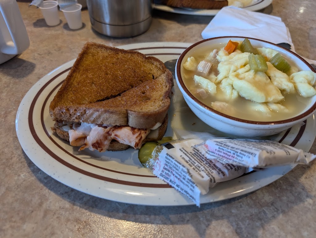 Good food. Their famous chicken dumpling soup was good. We also ordered the turkey melt and eggs and hash browns - the typical diner food. They have a lot of baked goods but we were too full to get anything else. $37 total with tips.