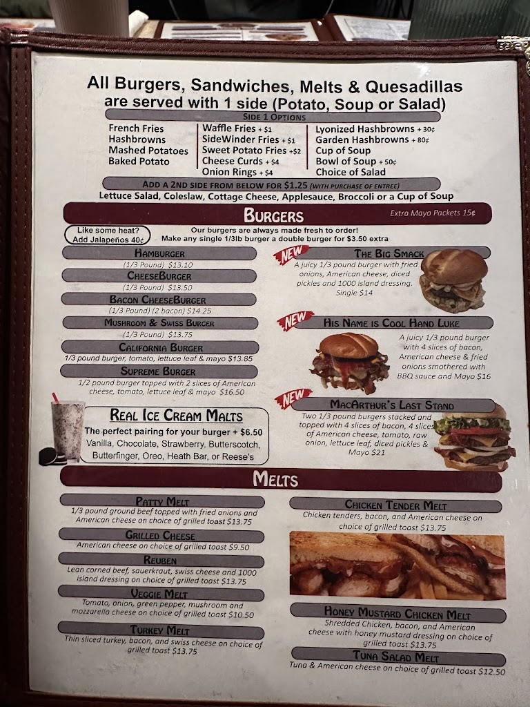 The variety of entries is mind blowing... everything from breakfast to dinner selections. Simple eggs and toast to specialty burgers & last but not least real down home cooking type meals.