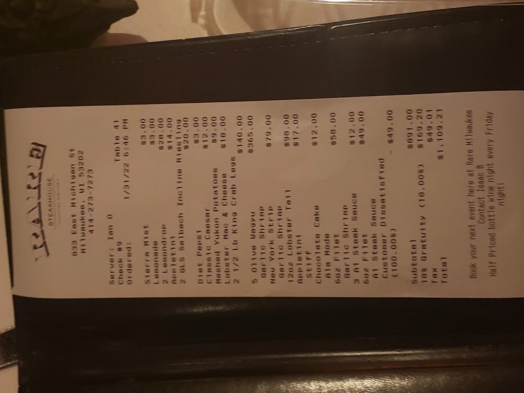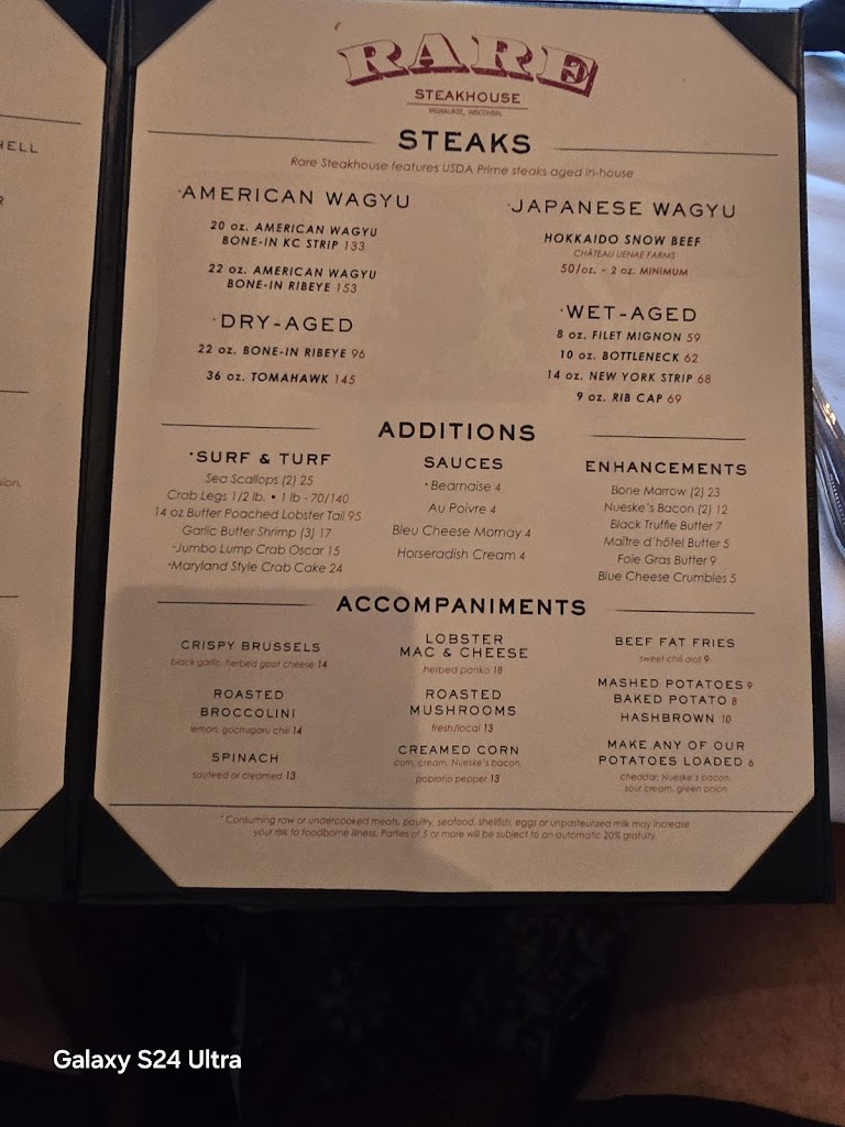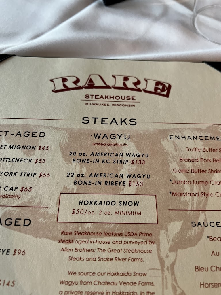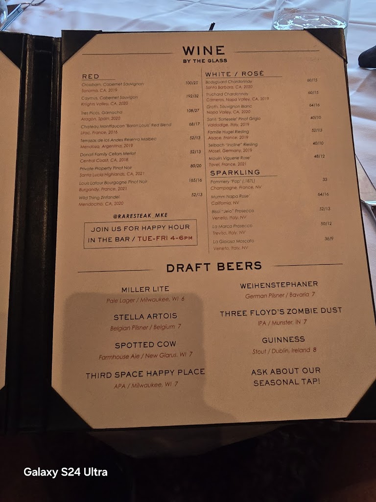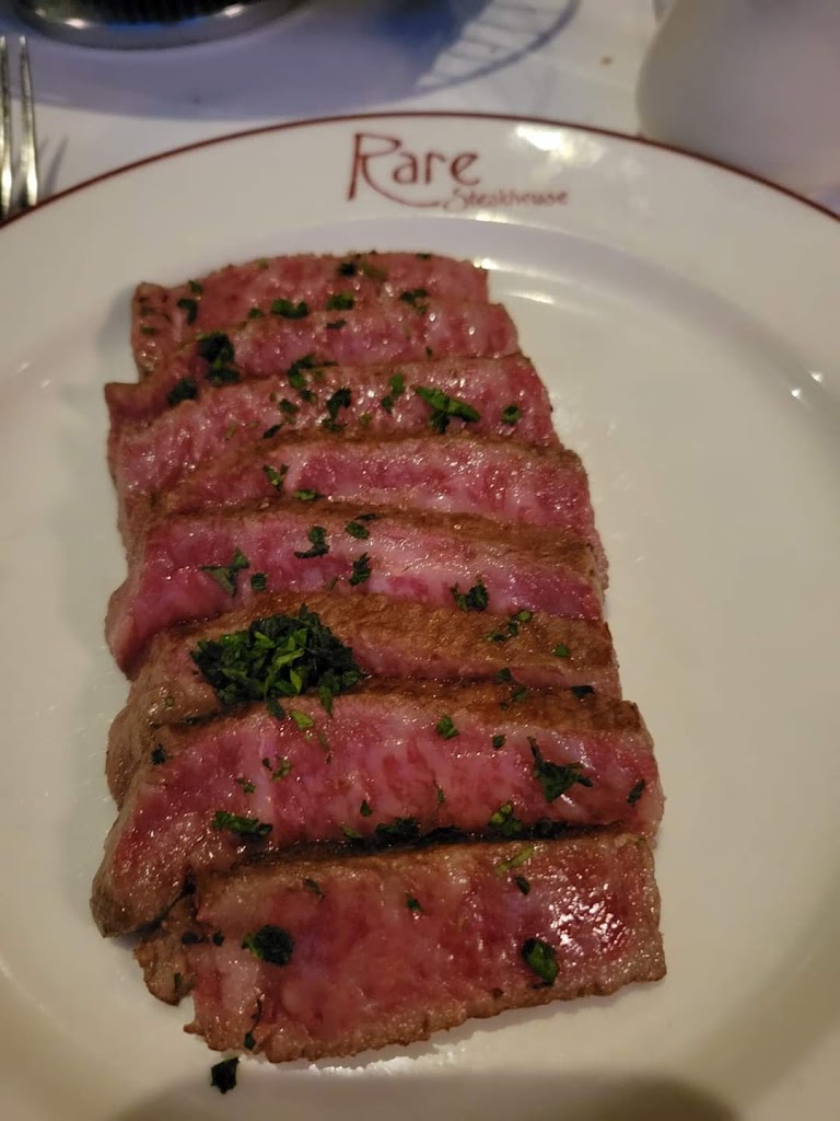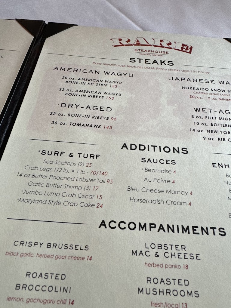 My fiancée and i came to Rare to celebrate our engagement and I have to say that it was the single best meal of my life. If you are a fan of places like Flemings, Mortons, etc. this place blows all of those places out of the water and it isn't even close. We ordered the a5 wagyu as an appatizer to start, don't even think about it, just do it. Then for entrees I got the single best steak of my life, the porterhouse. My fiancée ordered the 12 OZ lobster tail which is a must. Ask for Casey, his service was immaculate. We will be traveling to the city of Milwaukee again solely because of this restaurant!