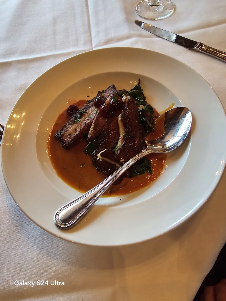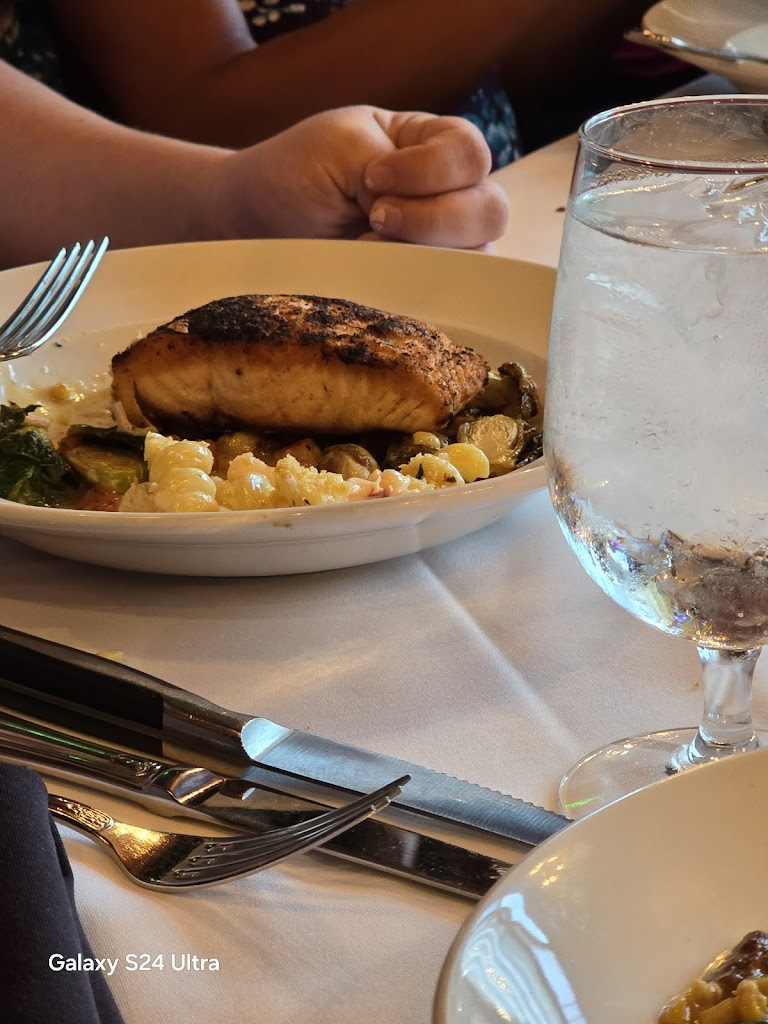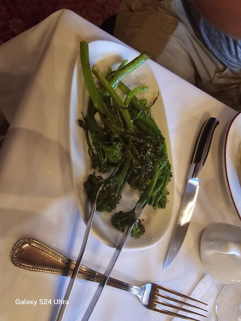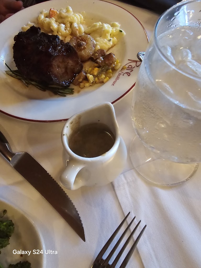 It was ok, the waiter was very polite but talked so fast about the many specials I couldn't understand at all, we asked for him to slow down and he did but it was still hard to understand so I just skipped trying Amy specials. The dry aged NY strip steak I ordered was cooked per order medium rare, but very chewy and a bit tendony, not what I would expect for a prime cut that was dry aged. Flavor was decent but not as buttery with the rich hearty flavor that develops with a dry aged steak. Sides were ok, Brussels sprouts were cooked very rapidly and still crunchy at their core. I prefer a little slower roasted and tender. Other sides were fairly similarly prepared very quickly without a marinated slow cooked flavor. For dessert I ordered creme brulee and a port, but they never brought the port. Creme brulee was well done with a very thick layer of caramelized sugar on top with a perfect golden color.
