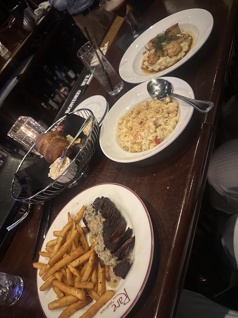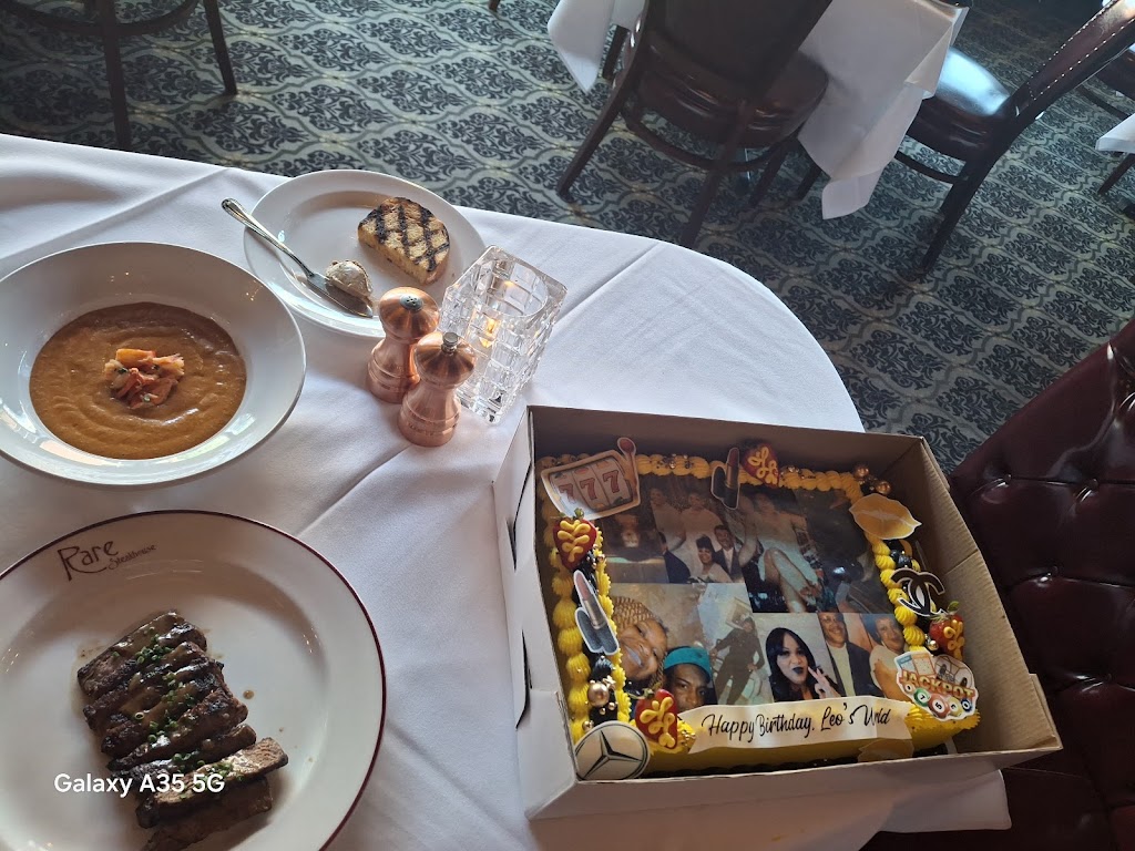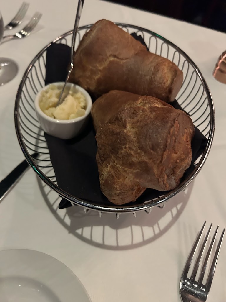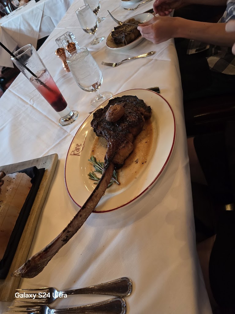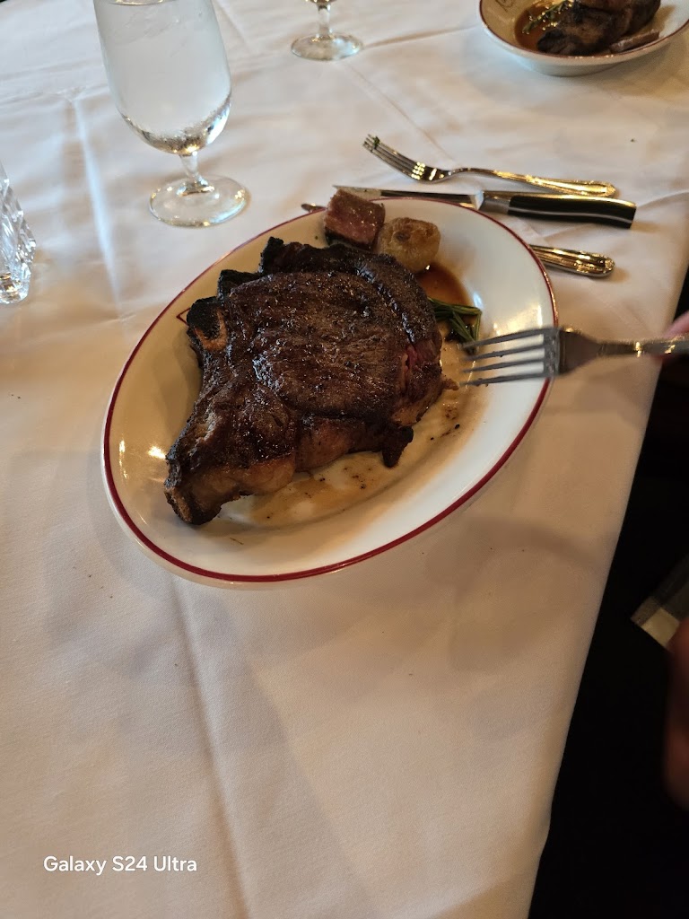 A wonderful restaurant with top-notch wait staff! The bone in ribeye was good, the lobster crab cake was delicious, the watermelon salad was good, the lobster bisque was delicious, the lobster mac and cheese was delicious, the brussel sprouts were good, the pop overs with the orange honey butter were amazing, the tableside bananas foster with banana bread was off the charts delish , the chocolate cake was good, and the bread pudding was tasty!