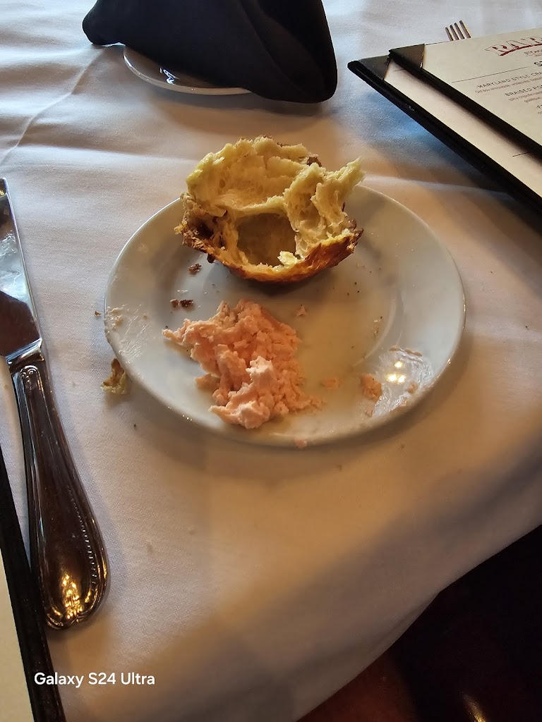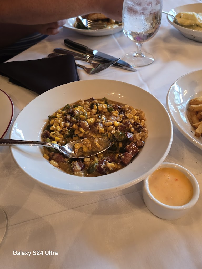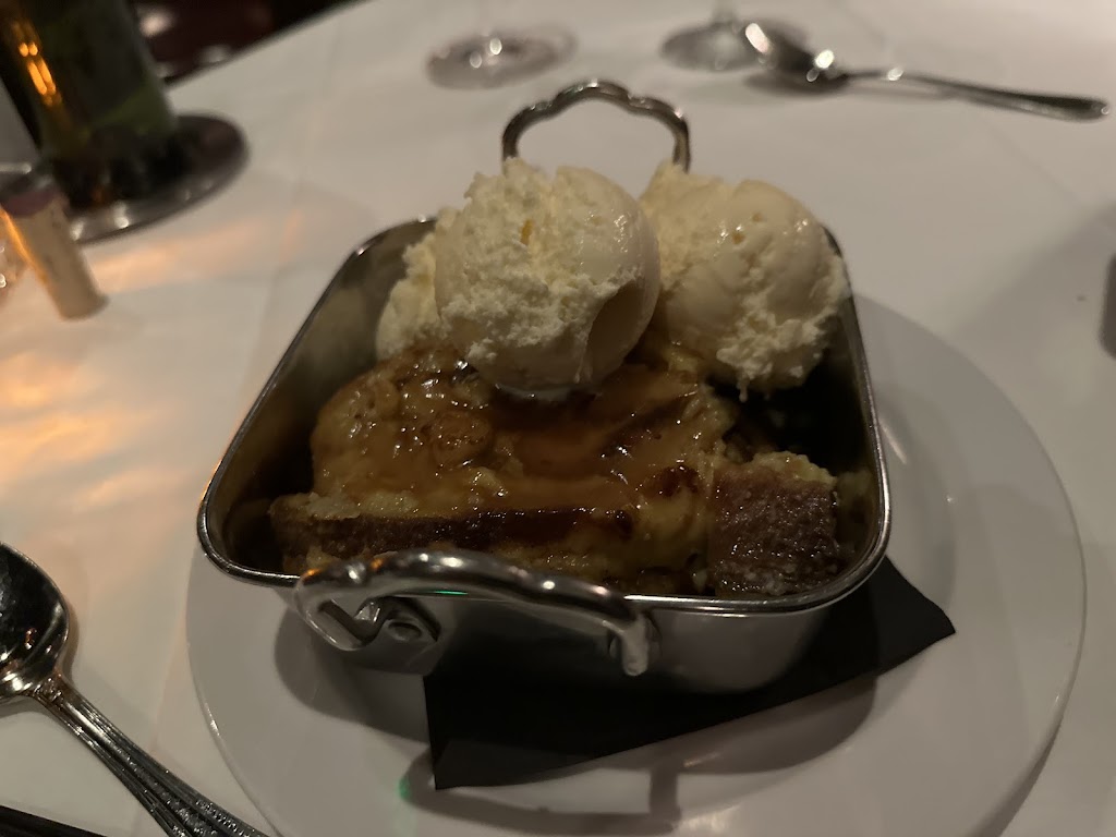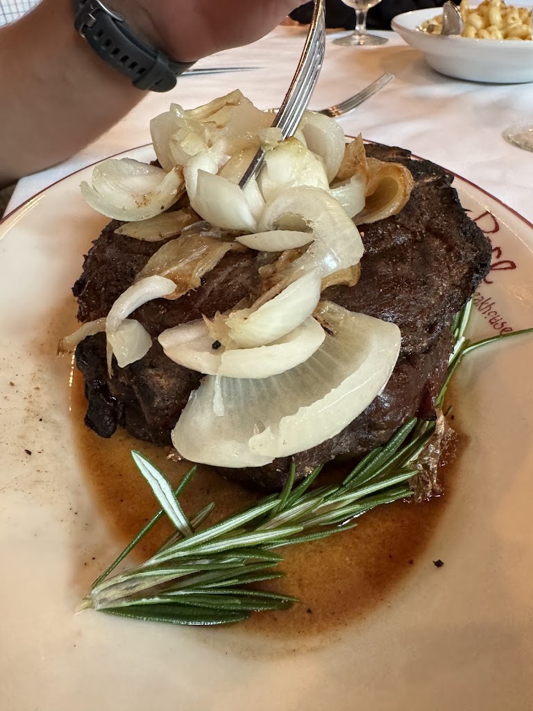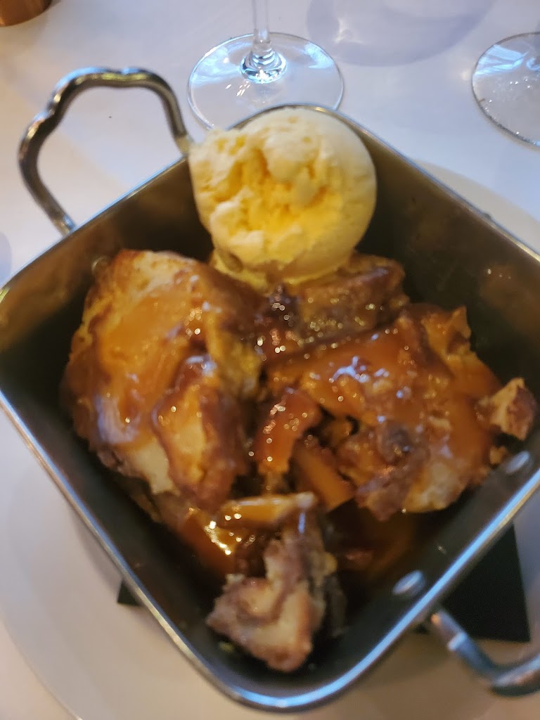 A wonderful restaurant with top-notch wait staff! The bone in ribeye was good, the lobster crab cake was delicious, the watermelon salad was good, the lobster bisque was delicious, the lobster mac and cheese was delicious, the brussel sprouts were good, the pop overs with the orange honey butter were amazing, the tableside bananas foster with banana bread was off the charts delish , the chocolate cake was good, and the bread pudding was tasty!