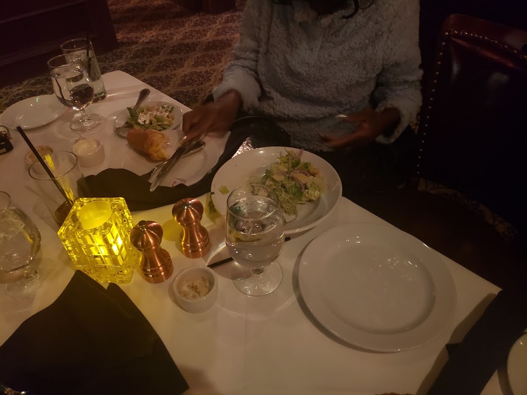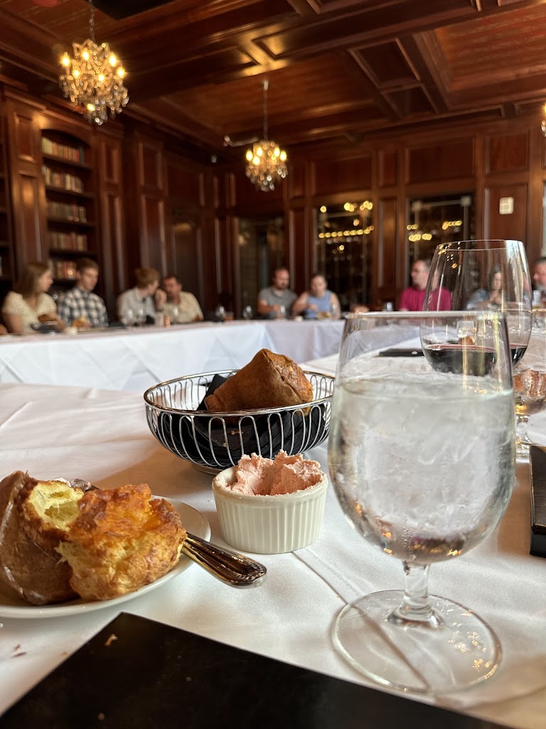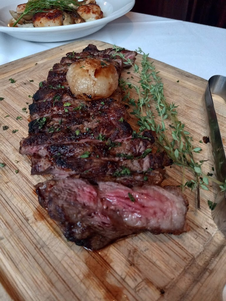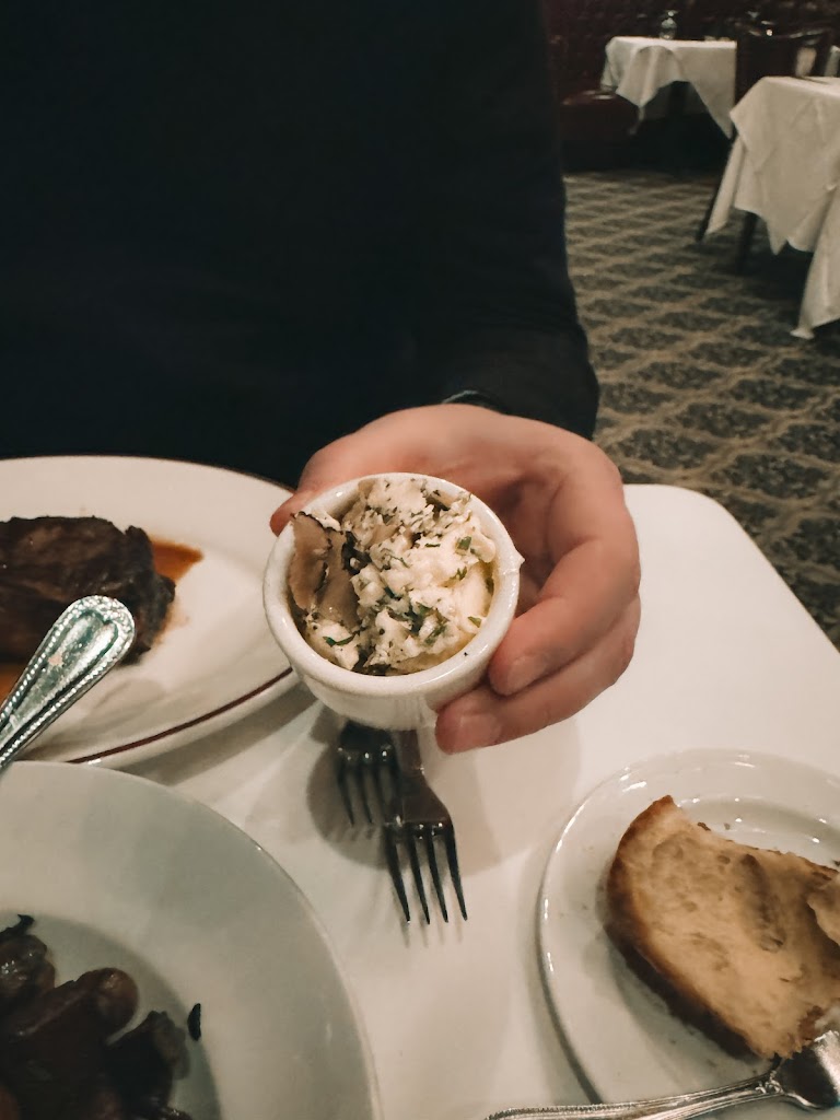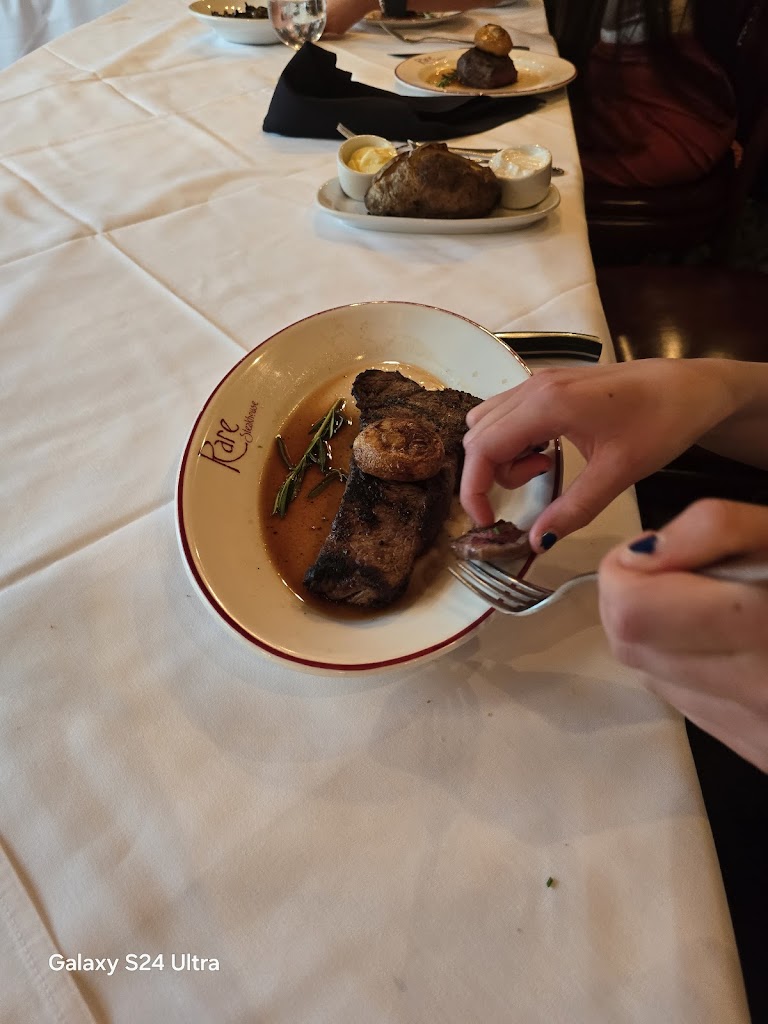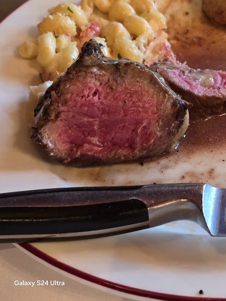 We went out for my birthday dinner, we had 645 pm reservations. We were seated right away but unfortunately in the back library area that was too bright and close to other diners. We got a bottle of wine and the waiter was going over the steaks. My husband and I are steak lovers and excited to try this place. Well our waiter was going over the wet aged steaks and the waiter said “wet aged steaks are similar to your grocery store marinated steaks” umm yeah not words he should use when wanting $50+ for a steak. We asked how long they were wet aged etc he has to ask the chef. He came back with 30 days. We ordered two steaks and three sides. Everything came out within 10 minutes(way too quick), plates not piping hot like you’d expect at a steakhouse. Steak was hot but could be hotter. super strange how quick it came out. I had the filet, ordered medium it was a little over cooked but fine. We didn’t ordered any sauce, because a good steak doesn’t need a sauce, but my plate was swimming in juice, it didn’t effect the flavor it just wasn’t pretty to look at. We both got the truffle butter $5 extra on the side, which was good but we could have shared it. Our sides were all great. I don’t think we’ll return. I mean $250+ after tip and no bread basket even…