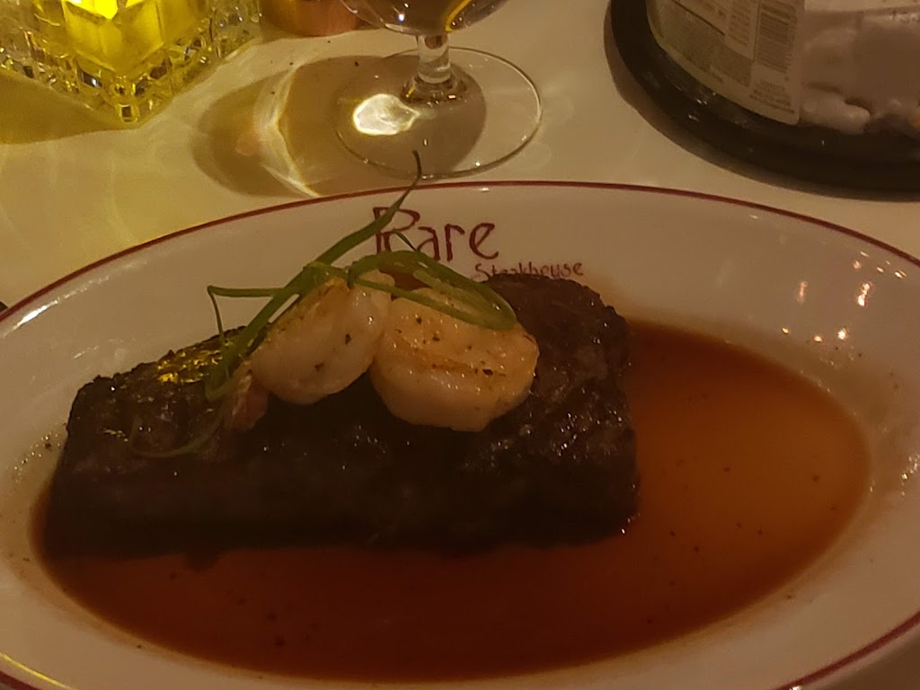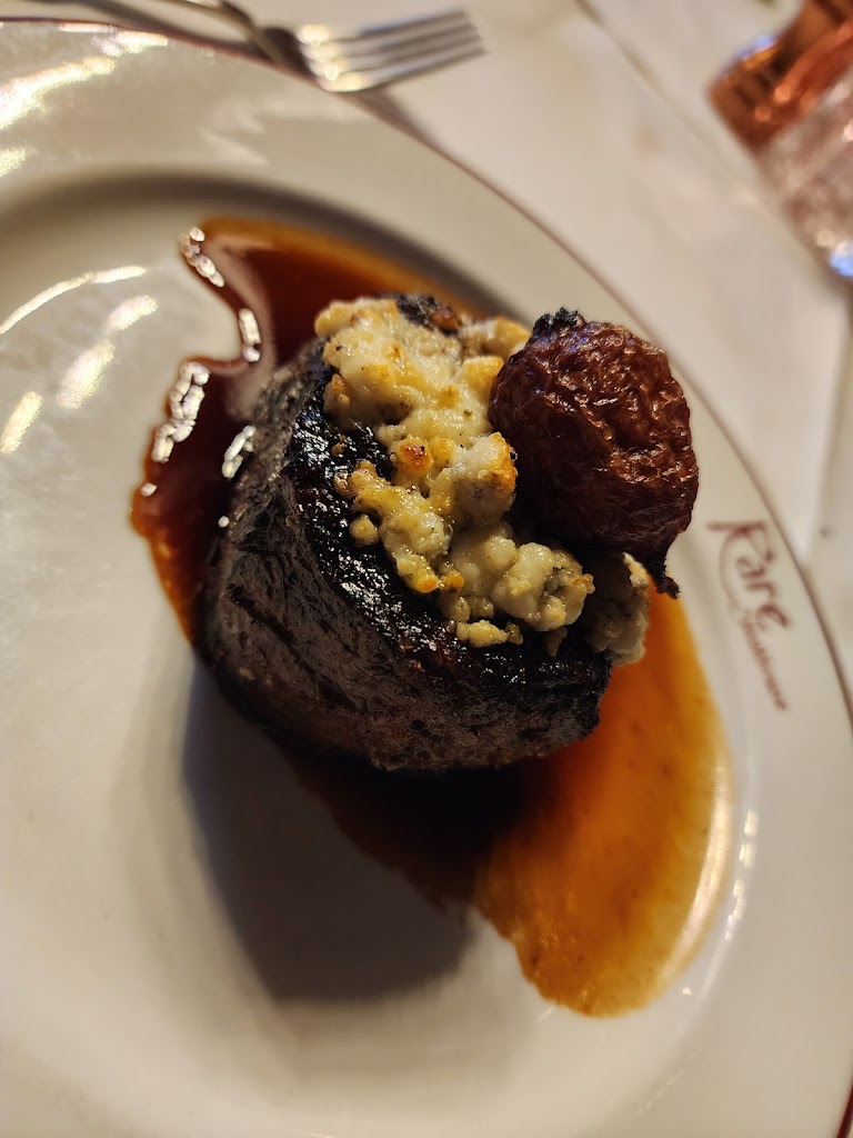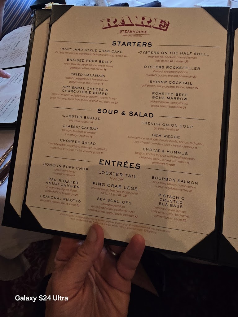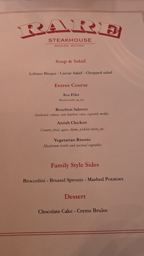 My son and I wanted to enjoy a classic steakhouse while visiting Milwaukee. Rare Steakhouse provided all of the features and ambiance we sought. The dinner rolls were huge, delicious popover style offerings. My wedge had a delicious house prepared bleu cheese dressing, and my son’s lobster bisque was fantastic. The bone-in filet with Oscar preparation and the NY Strip with a Maryland crab cake topping were outstanding. Chocolate cake and coffee were a perfect bookend to the evening. Service was prompt and unobtrusive - the staff freely and easily assisted each other. Particular kudos to the valet, who was chasing down cars in a driving storm. A top notch evening in downtown Milwaukee.