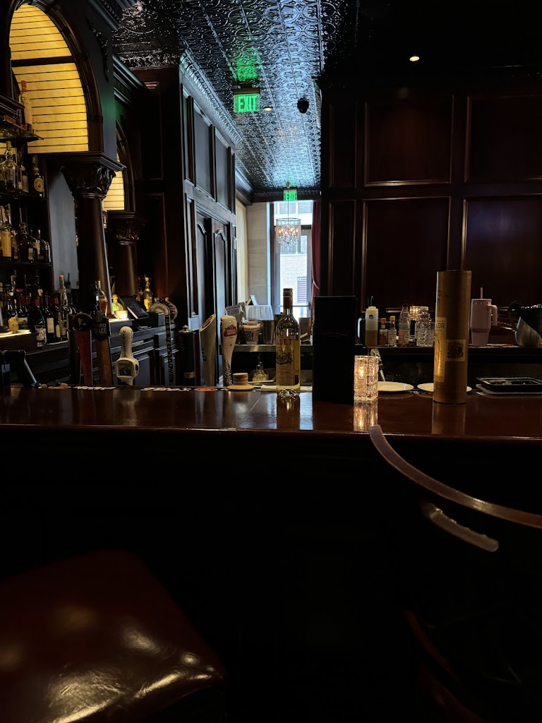 The atmosphere is old school dark bar, lots of wood, history and money without feeling intimidating (once you get seated and start interacting with your server, coming in feels a little overwhelming at first).