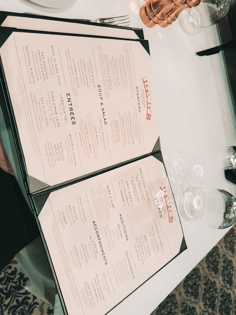 The menu was full of delicious options that weren't your run of the mill steakhouse choices. The Bone marrow was fantastic The 22oz wagyu was perfect, and the table side prepared banana fosters was excellent. The staff is full of knowledgeable folks who gave great advice on which wines, meal specials and desserts to choose. The wait staff wasn't dry and business only, they brought smiles and witty banter to the table, and really lightened up the mood.