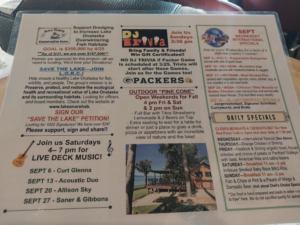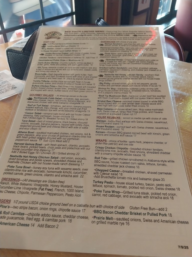 I would advise that if you are in a rush this is not the spot, but if you want a good meal with good company you can’t go wrong. This is one of our favorite places because we haven’t found anything on the menu that we don’t like, our servers are always kind and engaged, and the atmosphere is iconic Wisconsin. I mean what I said about the food, but if you need some direction the Pines Gyro and the schnitzel Sammy are craveable delights. Ribs and fish fry are unbeatable classics. My kids love the pickle pizza, cheese curds, and walleye cheeks, and my son’s go-to is the Tide Wrap.