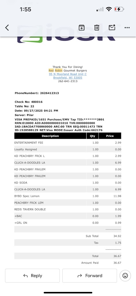 Starting off the prices do not match the food. I played it simple and got chicken fingers and before you say anything I know it's a burger joint. However they we're dried and over cooked. My girlfriend got a chicken wrap, heavy on the wrap light on everything else. The buffalo sauce looked more like buffalo paste,I mean you could spackle holes at the house if you needed too. So with all that being said I would avoid Red Robin in Brookfield unless you like Sub par food for steak house prices.