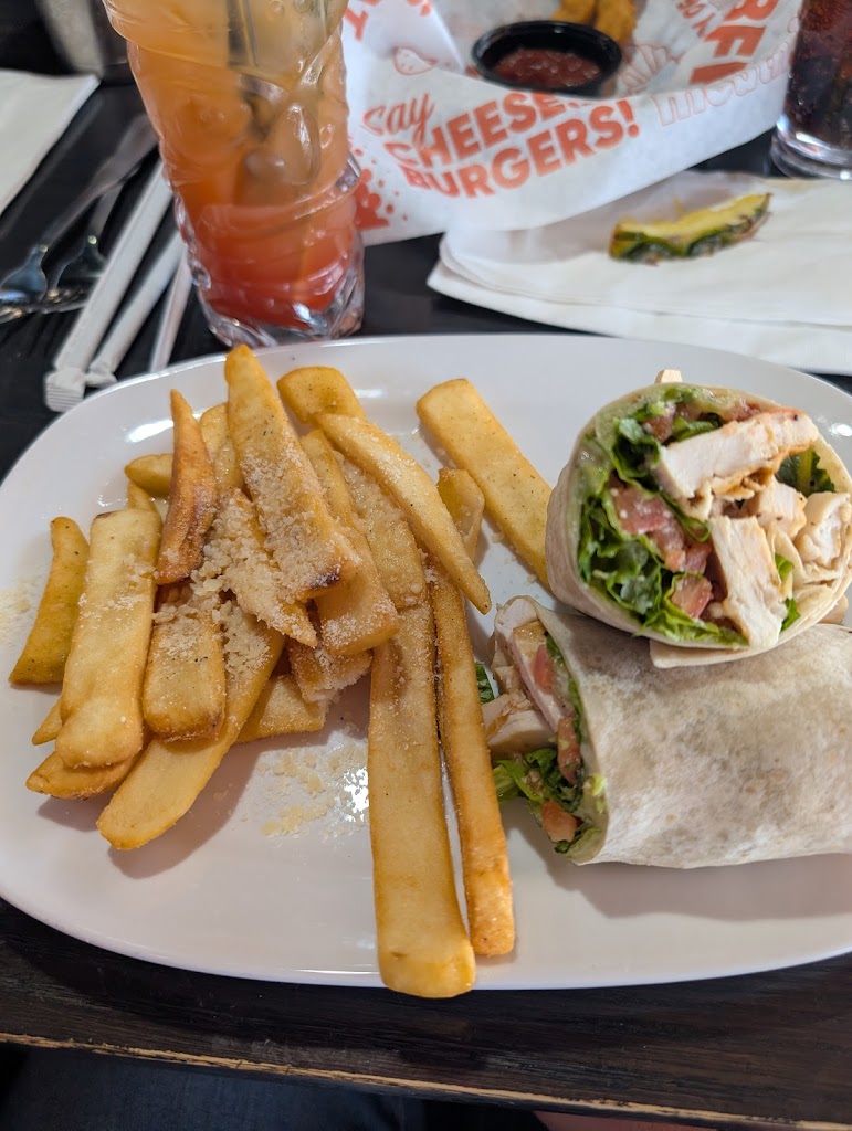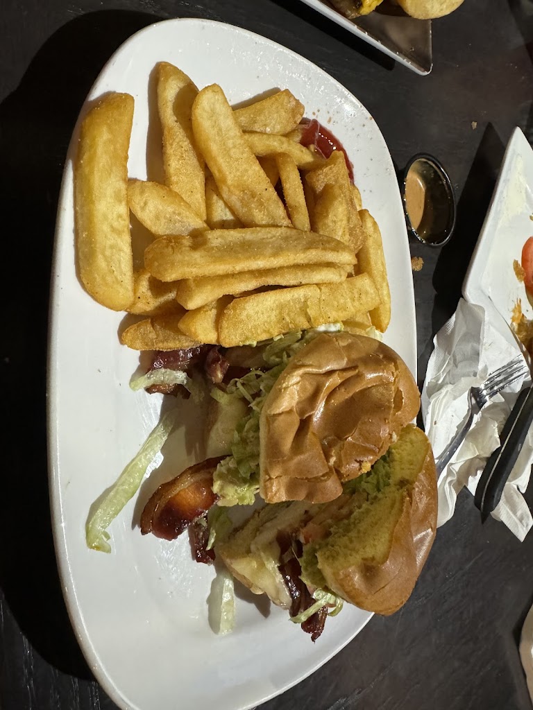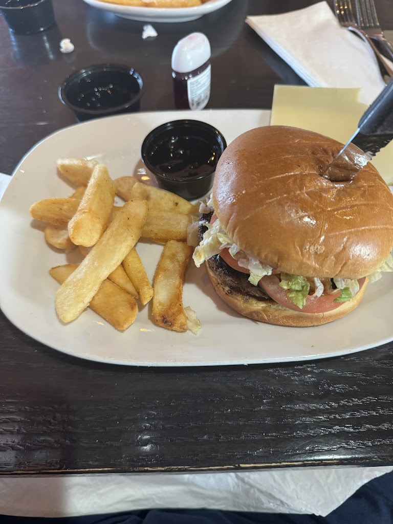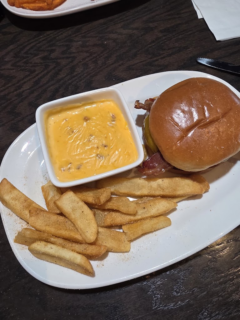 We were lead to a table with something spilled in front and under it. Moved ourselves to a booth in the bar. Service ok. Burger was delicious!! More fries could have been served. When asked for more, 6 fries were in the basket🤦🏽♀️. Understand not wasting but skimping doesn’t solve the issue. Happy medium would have been devine.
