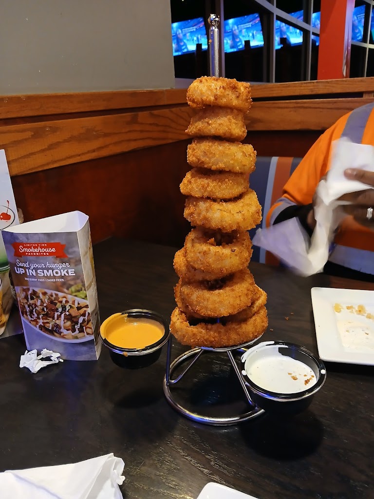 While we were waiting for our food, we got the crispy onion ring tower with their delicious campfire sauce and the new Mike’s hot honey chicken wings.