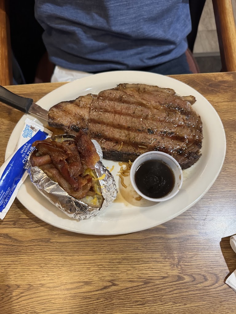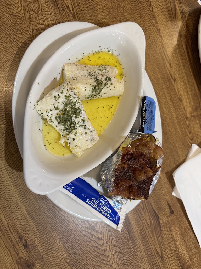 Prime rib was a large tender piece and very flavorful. The loaded baked potatoes had real strips of bacon and fried onions. The deep fried shrimp were very large and delicious. Baked cod was cooked perfectly and served with lots of butter. We left stuffed 🤤