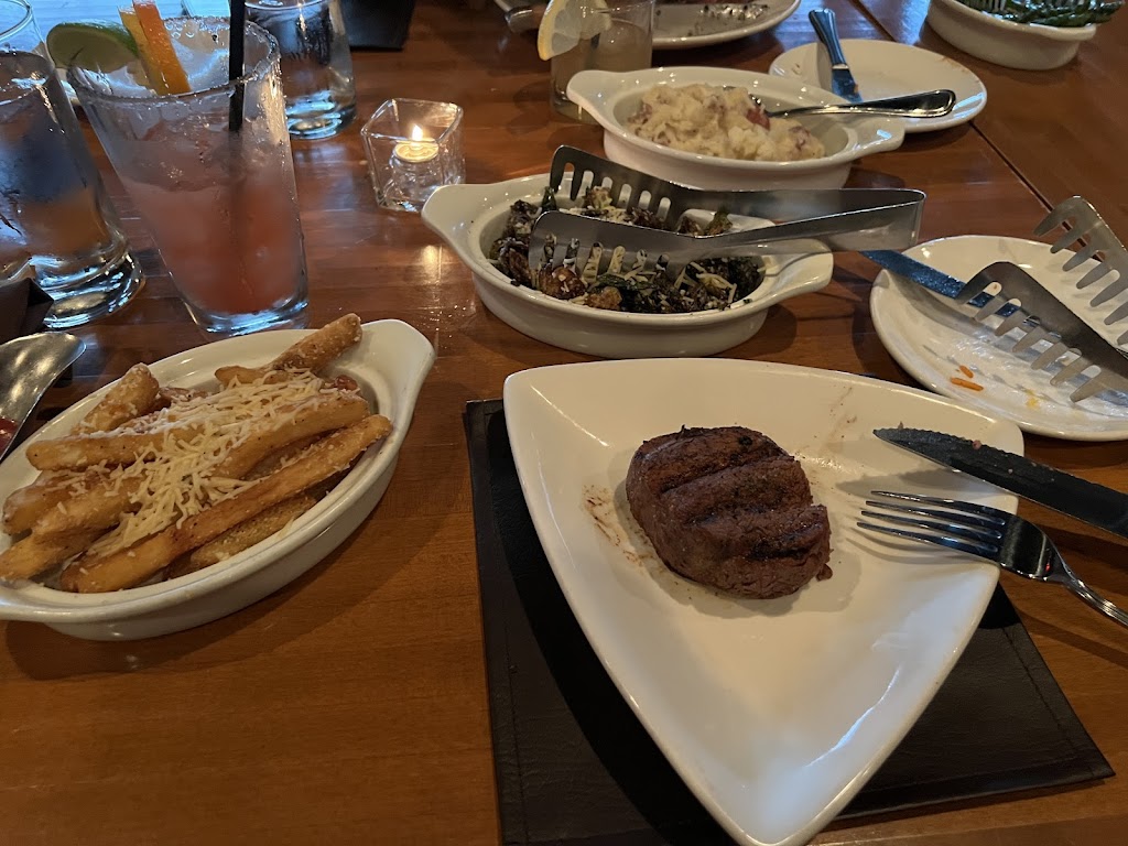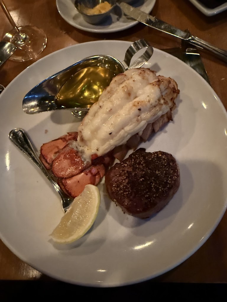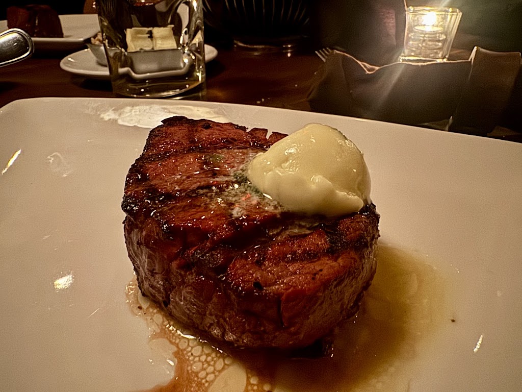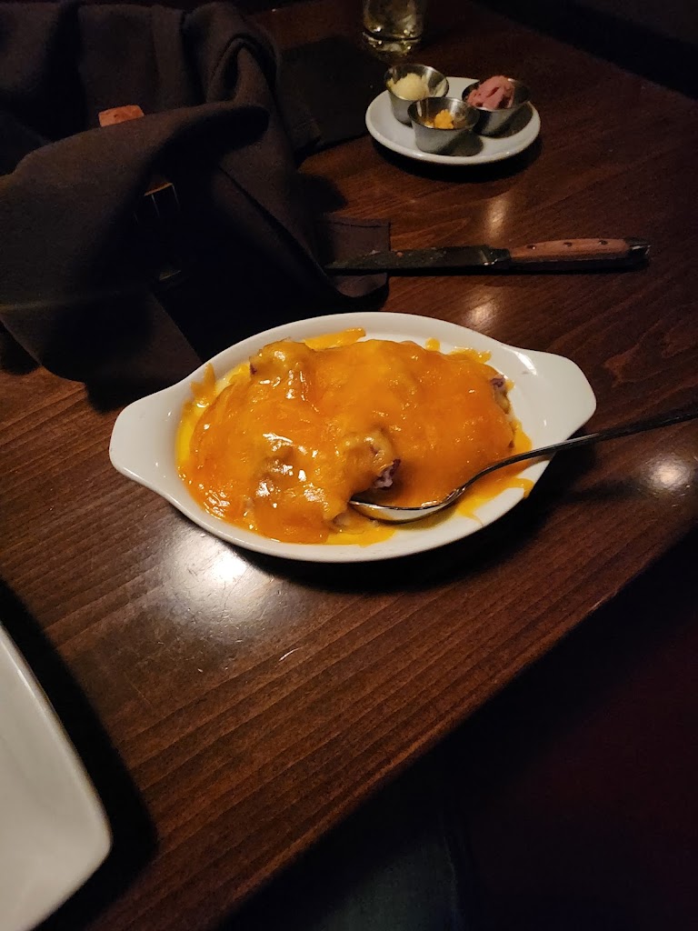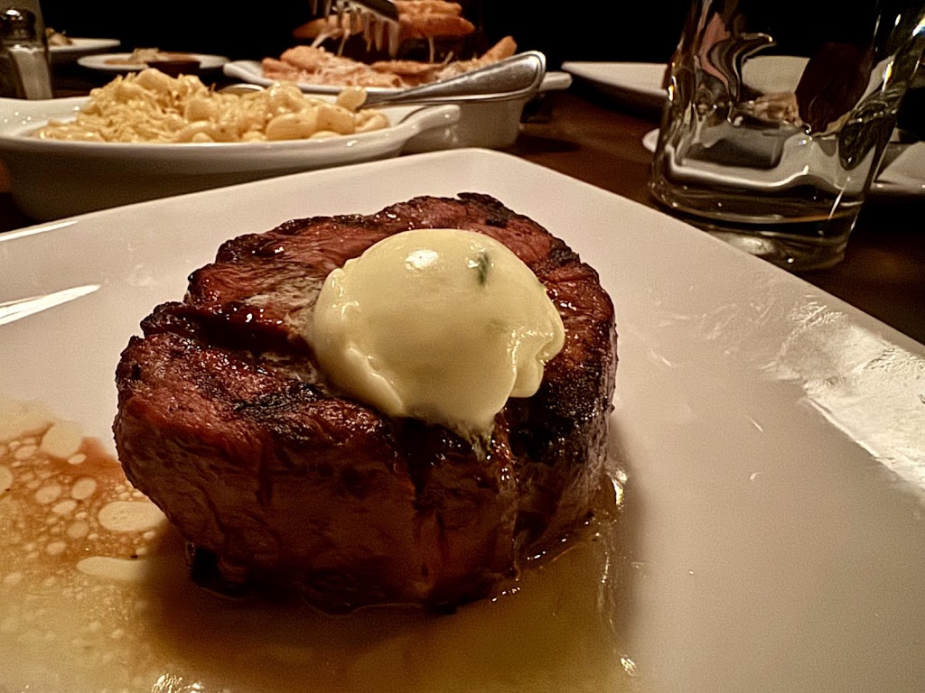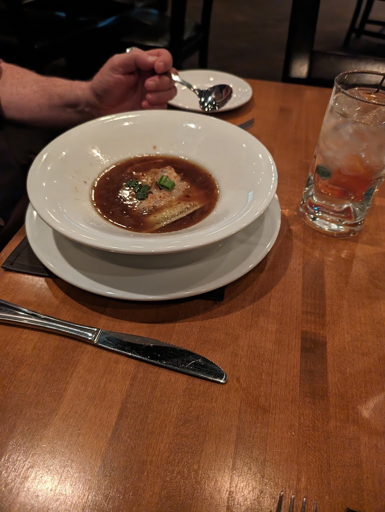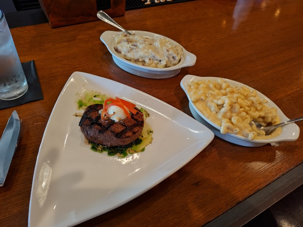 The filet was as good as it gets here. The service from Mr. T at the bar was pretty rough. I'm hoping/guessing he is a new hire. I wish I was hungrier so I could try the other sides. French onion soup was different but tasty. Hoise salad dressing was on the sweet side for my palette.