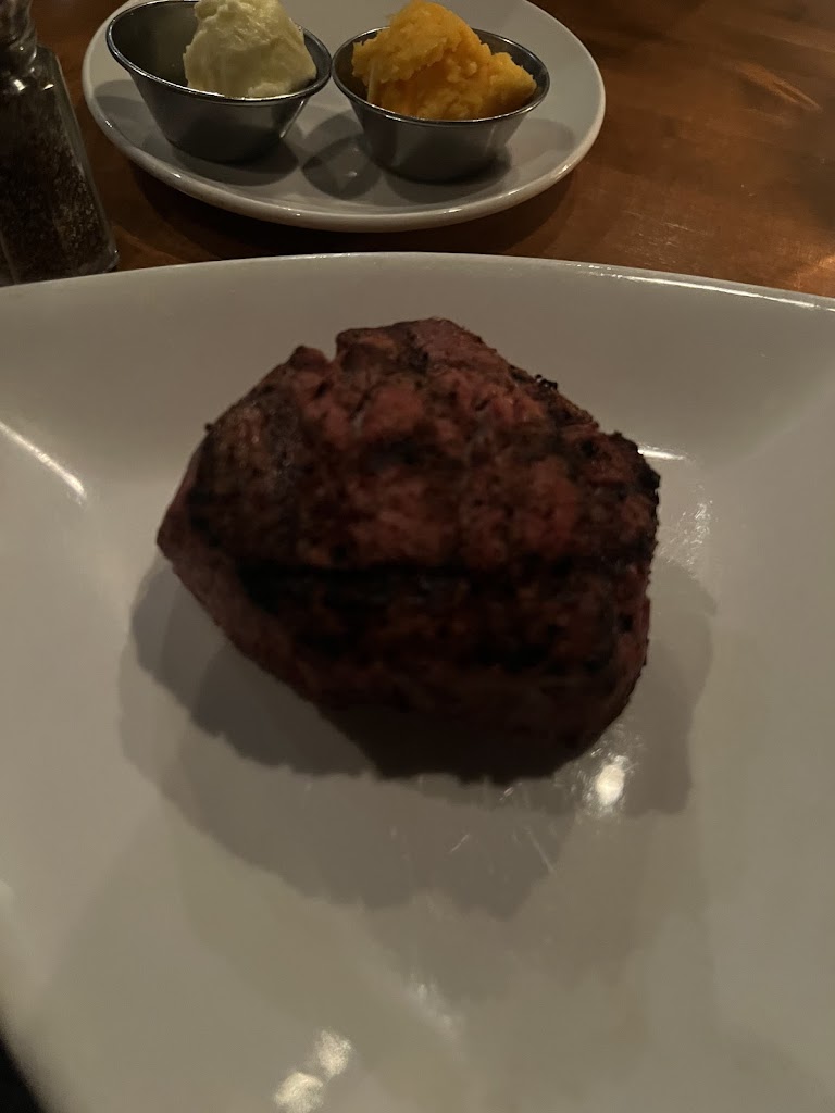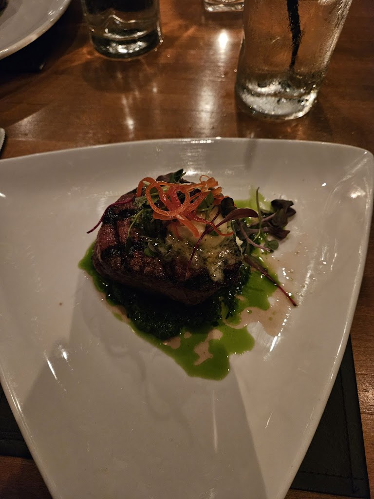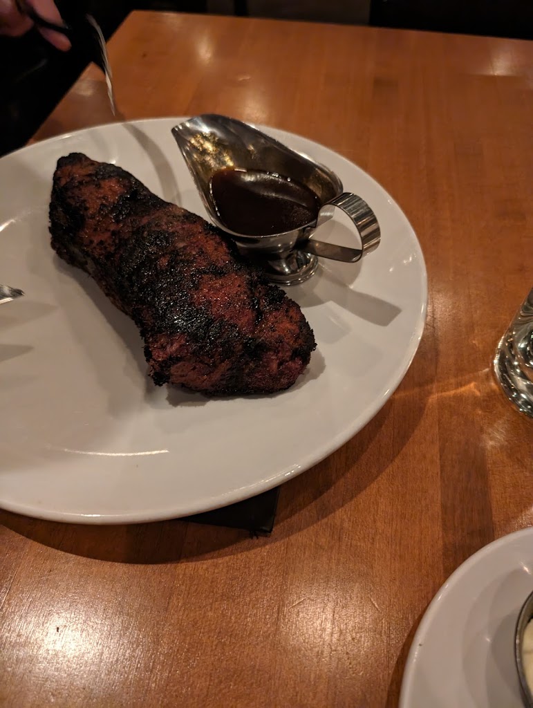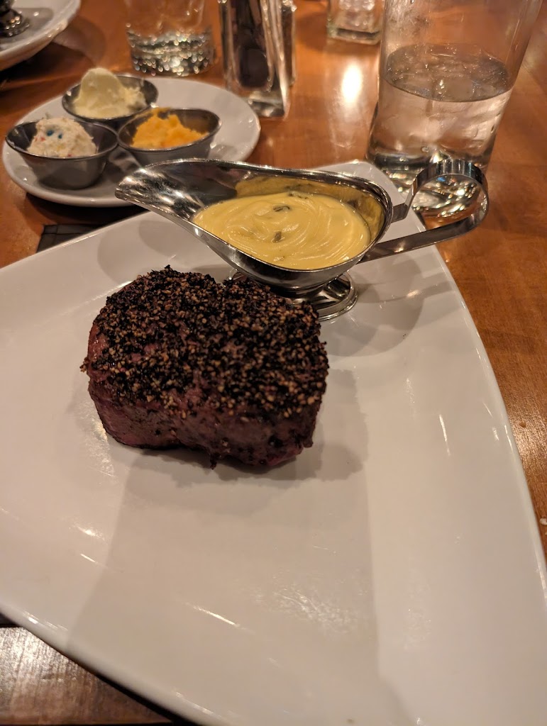 Then came the steaks. I ordered a filet with bernaise sauce and peppercorn crust, That was absolutely fantastic. Easily a top 5 steak. My dad ordered a New York strip with Blackened seasoning and Au jus. He said his was also excellent and has quite a kick to it in terms of spiciness.
