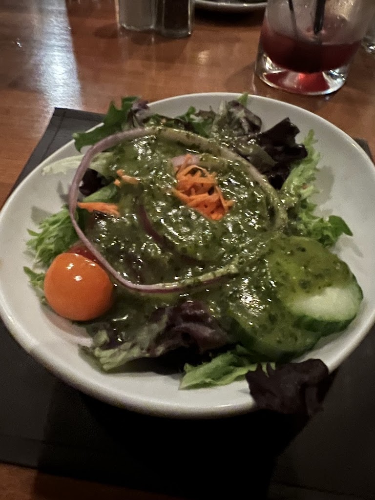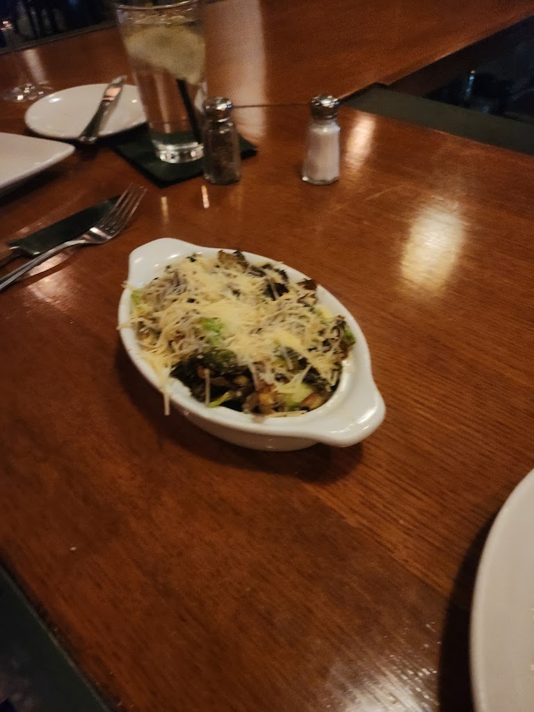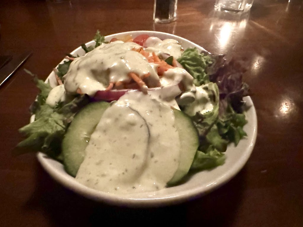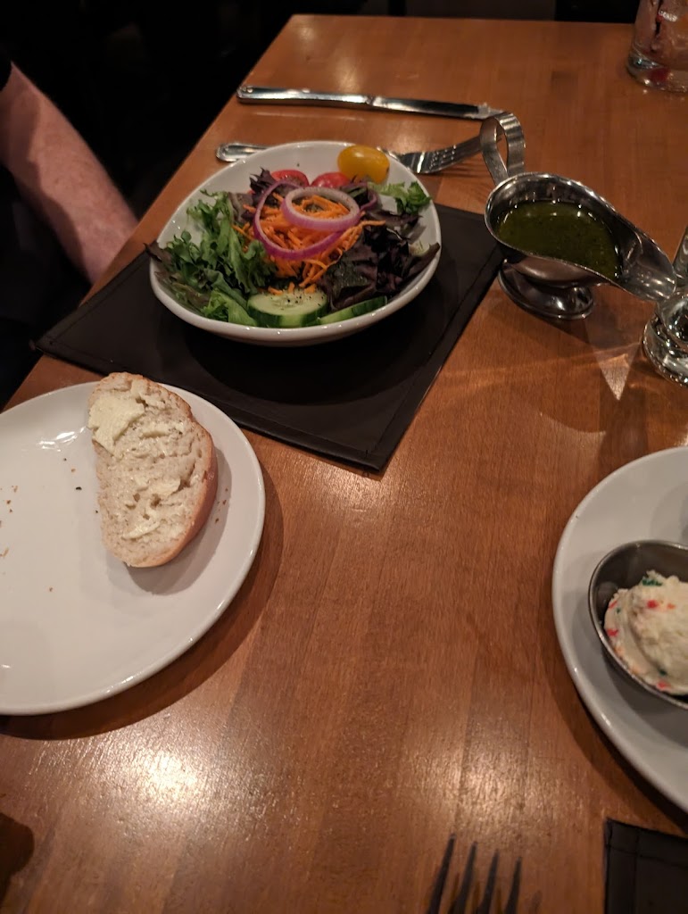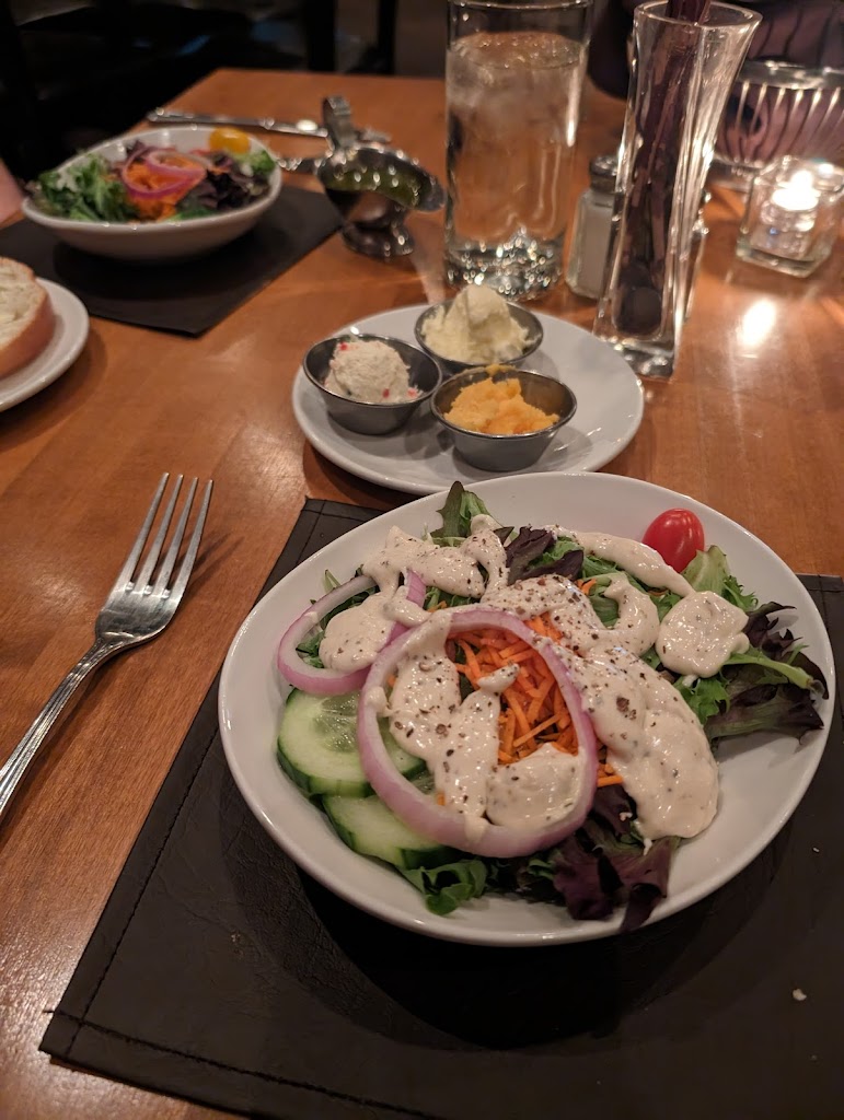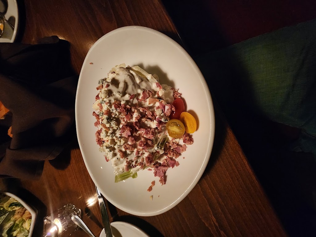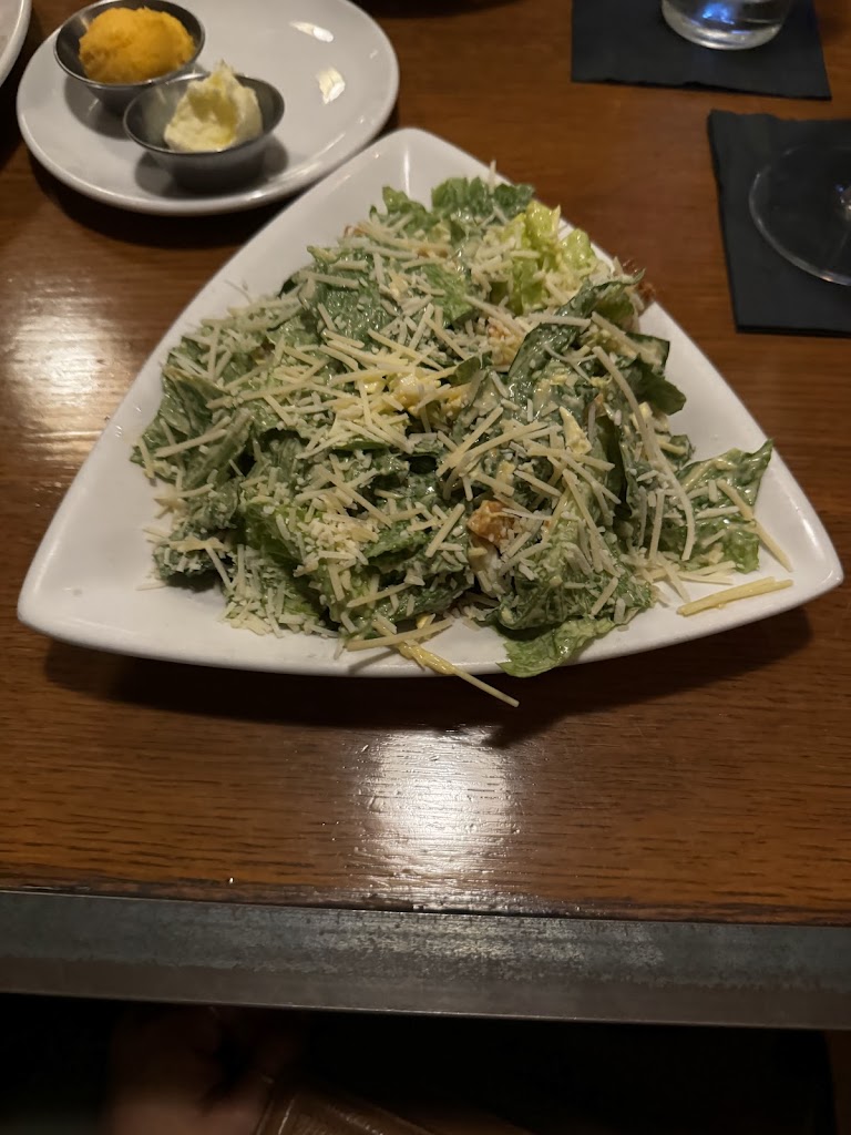 The texture of my ribeye steak was off, maybe overdone. Way too much dressing on my salad, turned to soup. Waiter was great. Pretty pricy for underpar food.