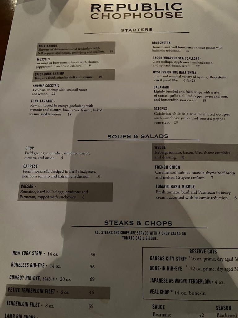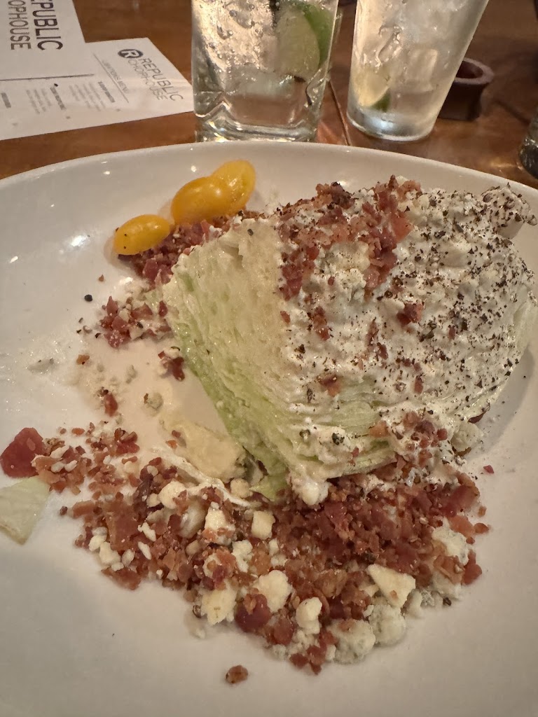 Cowboys ribeye tasted like sirloin. Wedge salad was tasty, as was the tomato basil soup. Drinks were great and server was a delight.