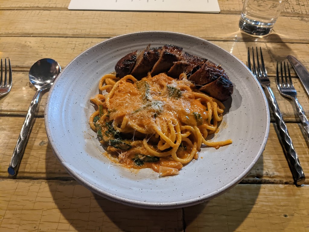 Delicious drinks and the pasta was homemade and good. Only 1-2 vegetarian options. Great outdoor patio.