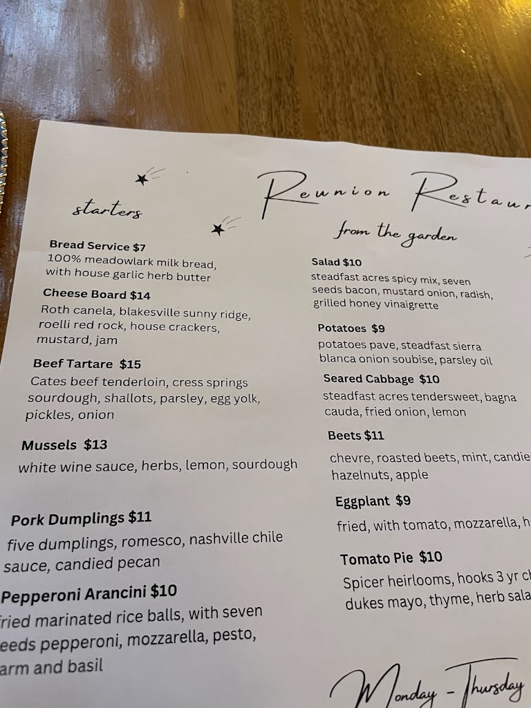 Reunion is a must visit restaurant. The atmosphere is stunning. The food is delicious. The cocktails are one of kind. The service is outstanding. I felt lucky to eat the impeccable food in this historic building. The prices are so reasonable and the celebration of local farmers is awe inspiring. Please visit this spot - You won't regret it!