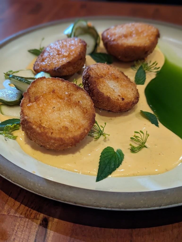 Excellent, creative food and drink. The Family Traditions cocktail was so, so good! The fried saltines were a terrific idea, and went so well with the pimento cheese and the salmon spread. BBQ chicken was very flavorful, and not dry. And whoever thought up the fried potato salad deserves a James Beard award. My god but it was good. Lima beans were very nice (and kudos for even having Lima beans in the menu!) but needed a bit of salt; an easy fix. Terrific space inside an old bank. The only clunk was the service: my order got bollixed up, but staff were quick to correct it as much as they could. It happens. All in all a terrific place. Well done, folks. It wasn’t the healthiest meal ever, but it sure was good!
