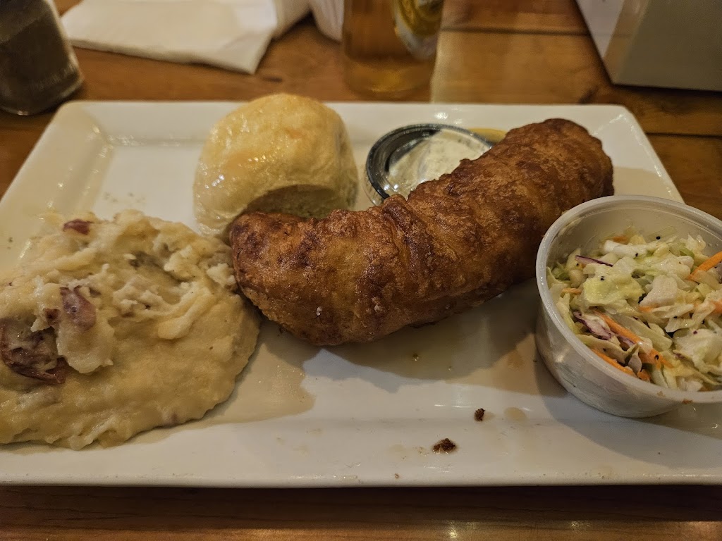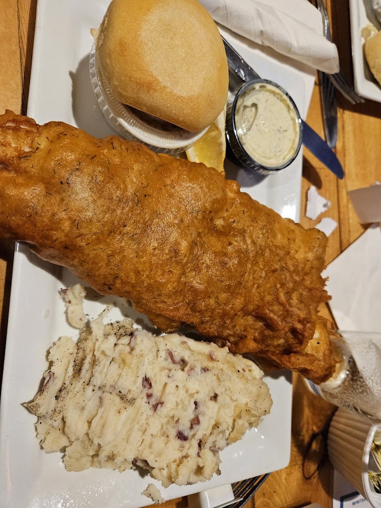 Other than having to wait for an hour for our food, the location was nice. It's more of a bar than a restaurant. We didn't get our dinner roll either, but otherwise, food was typical fish fry. I didn't really taste the beer in the batter, but cod was hot and flakey. Missed the garlic in the potatoes as well. Waitress was attentive and polite.