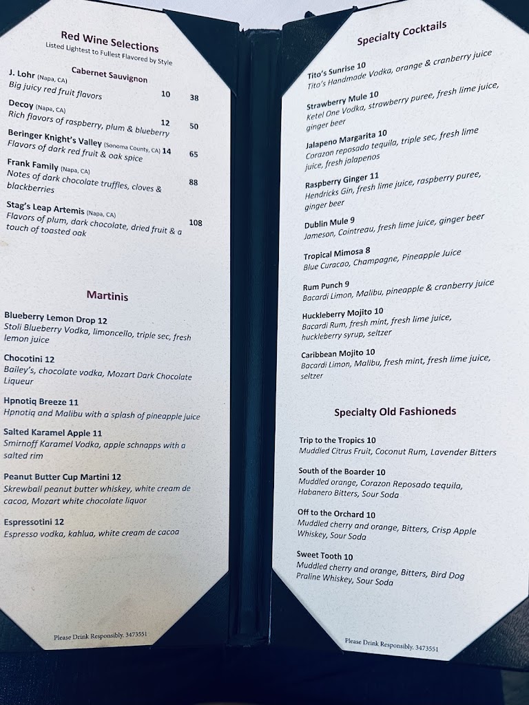 Good cocktails, salad bar could use a soup option, entrees are very good, waitress seemed overwhelmed and forgot about us at times and never shared the nightly specials