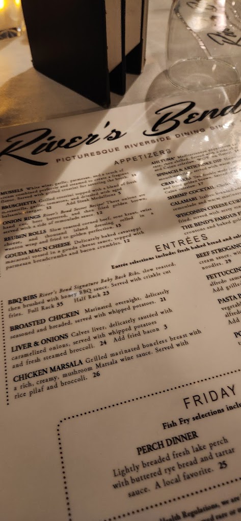 Rivers Bend was very nice. The food was delicious, the service at the table and the bar was outstanding. I don't really have anything bad to say about this supper club, other than it being more expensive than any other supper club I've been to. I ordered a New York Strip and rice pilof and the price was just over $50. My wife ordered the fillet mignon and asparagus and that was closer to $60. If you can afford these prices in this economy, it's a definite recommendation.