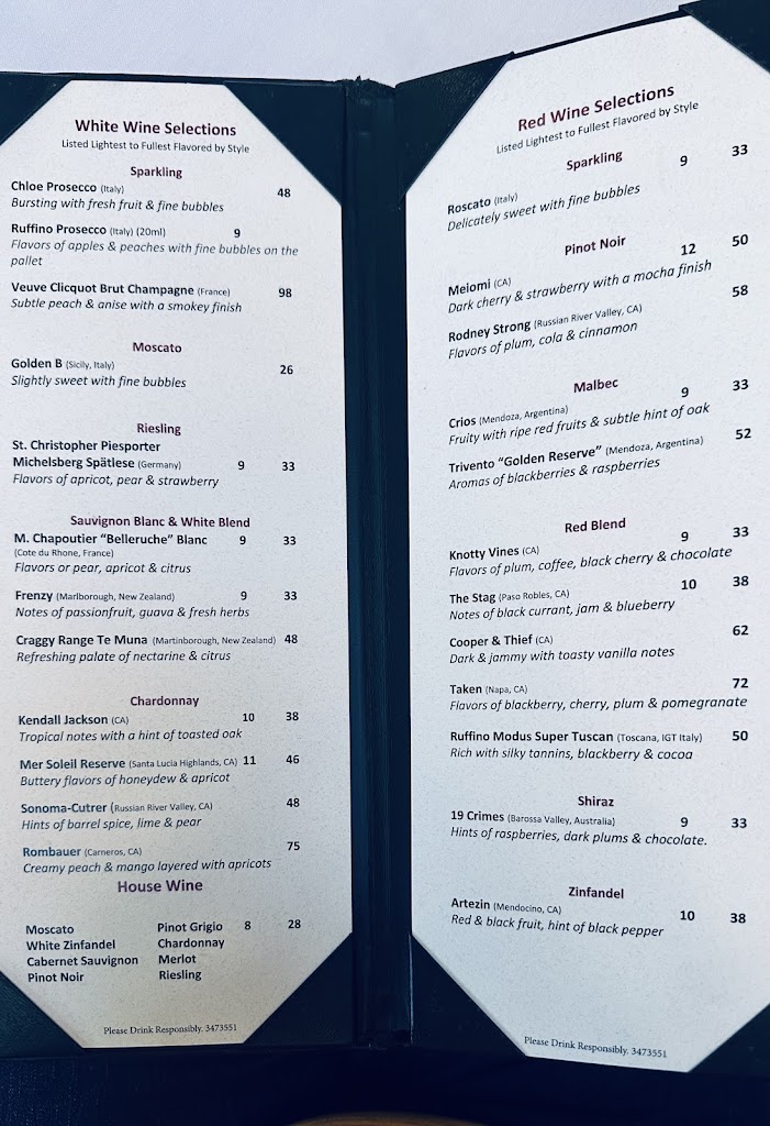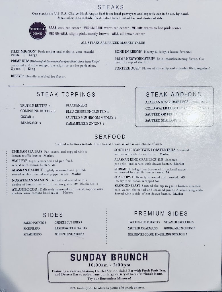 Incredible views of the river, fresh and high quality salad bar, steak was delicious and cooked to perfection. Top of the line soperior supper club experience.