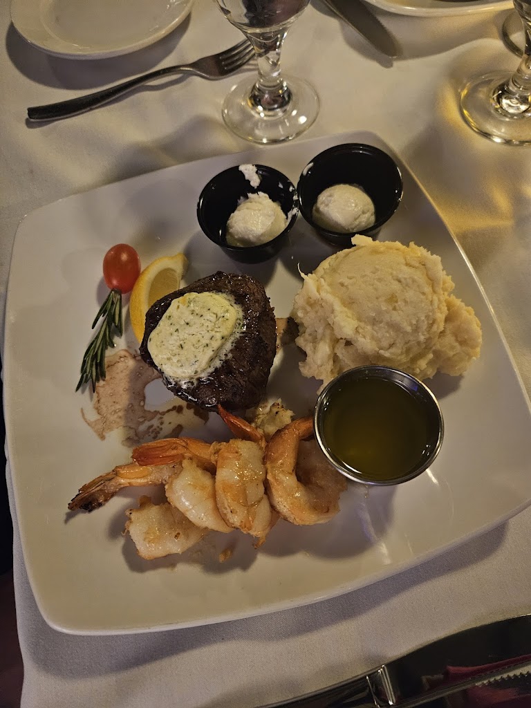 The meal was lights out in flavor and presentation with us enjoying two separate steak dishes that were delicious and plentiful. I had the Friday special of fillets 3 ways and my wife had the petite fillet which were very reasonably priced and arrived to absolute perfection exactly as ordered.