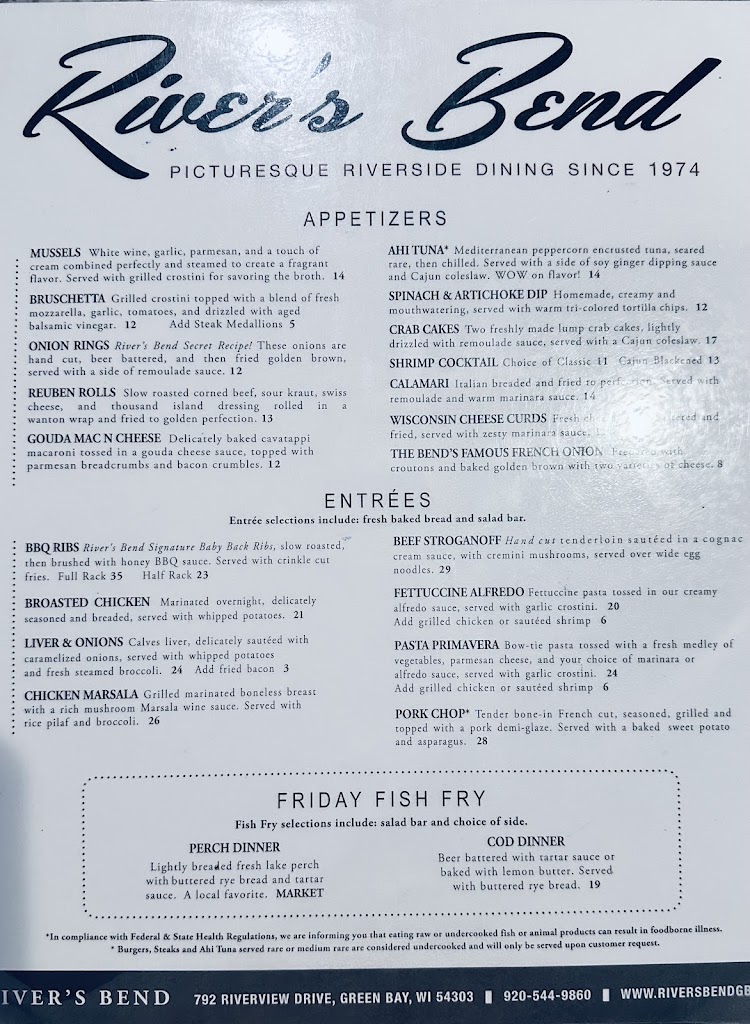 I highly recommend Rivers Bend, but get a reservation early to enjoy a taste of Green Bay.