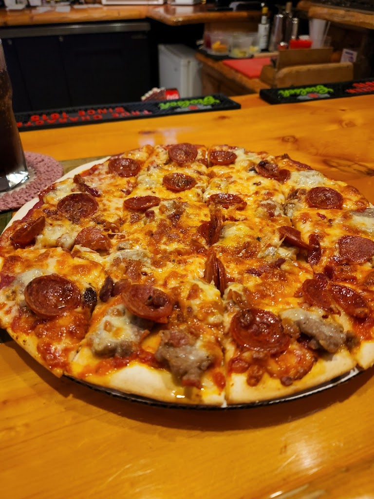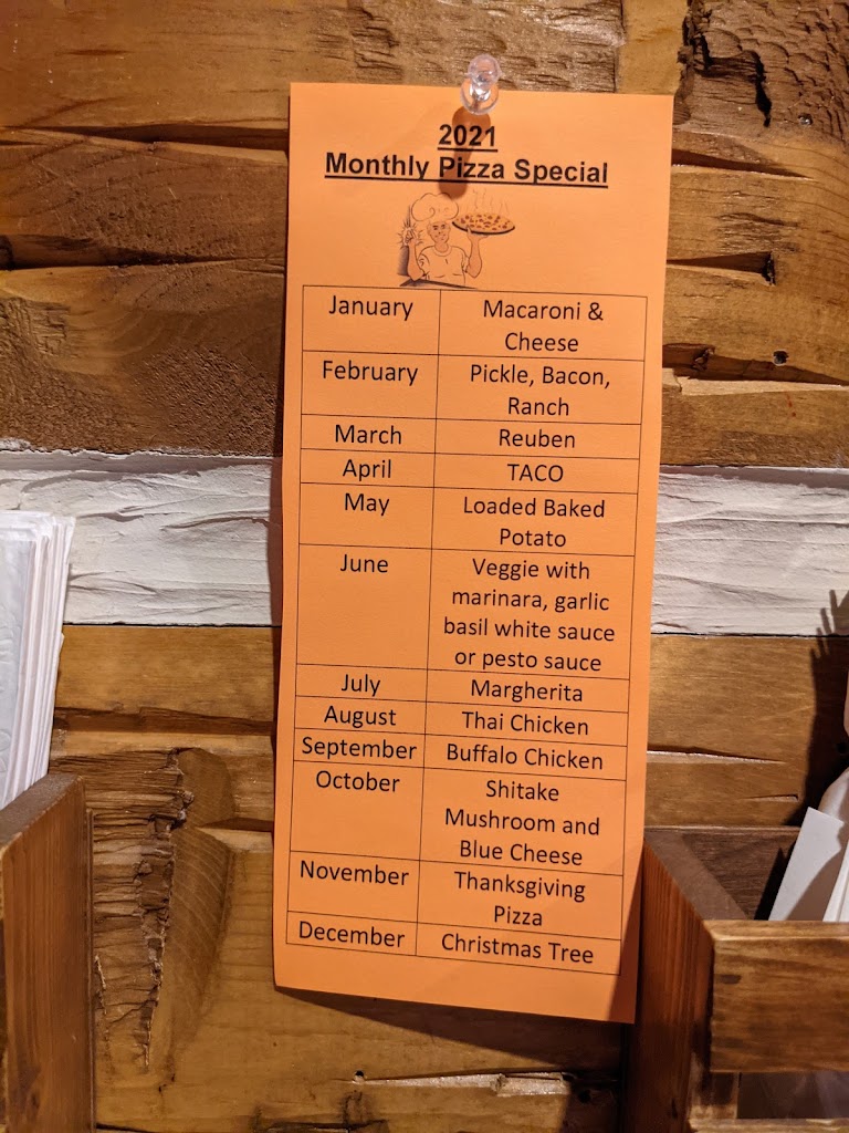 One word…YUM!!!! Amazing pizzas, delicious garlic bread with cheese, tasty old fashioneds and service like no other all in a cozy log cabin atmosphere!