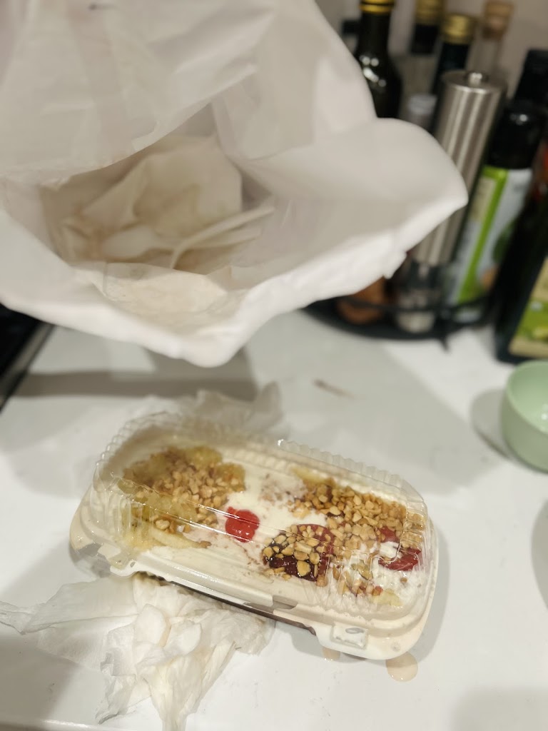 Ordered a banana split and in the 5 minutes it took me to get home I realized the bottom of the bag was soaking wet. When I opened it all of the ice cream was completely melted and leaking out of the container all over the bag. Not sure how the ice cream melted so quickly- the air conditioning was even on in my car. It was disappointing ice cream soup.